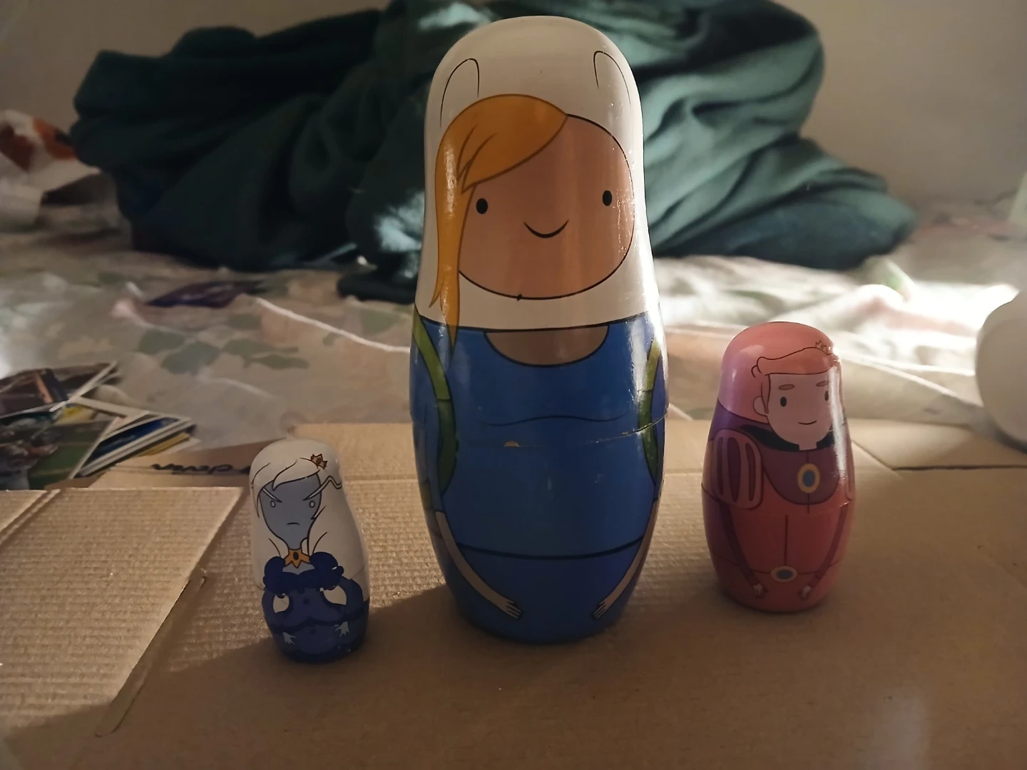 This set features three nesting dolls. The largest doll is Finn the Human. The middle doll appears to be Prince Gumball, and the smallest doll is Ice Queen. These are fun decorative pieces for any Adventure Time fan!