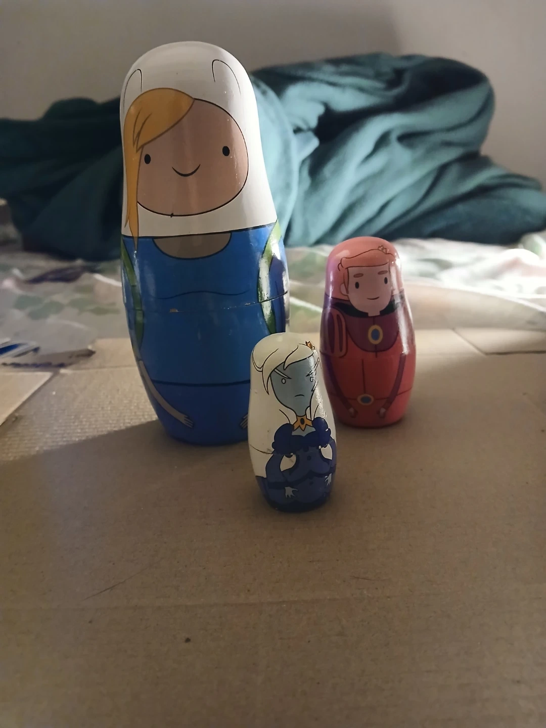 This set features three nesting dolls. The largest doll is Finn the Human. The middle doll appears to be Prince Gumball, and the smallest doll is Ice Queen. These are fun decorative pieces for any Adventure Time fan!