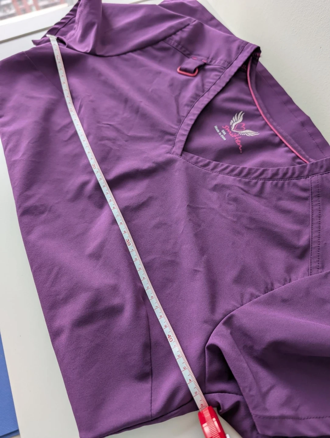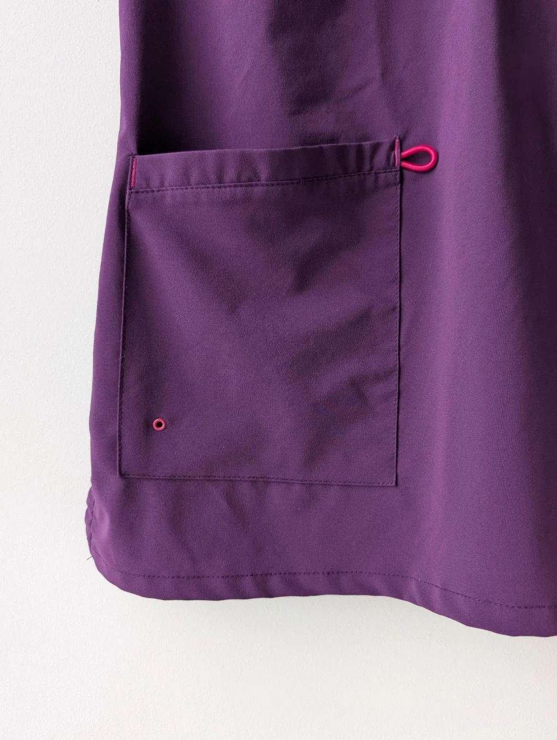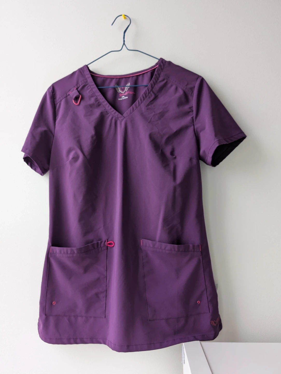 This is a Skechers V-neck scrub top in a lovely purple colour. It's a size xs and made in China. It features multiple pockets for practicality and a comfortable fit.