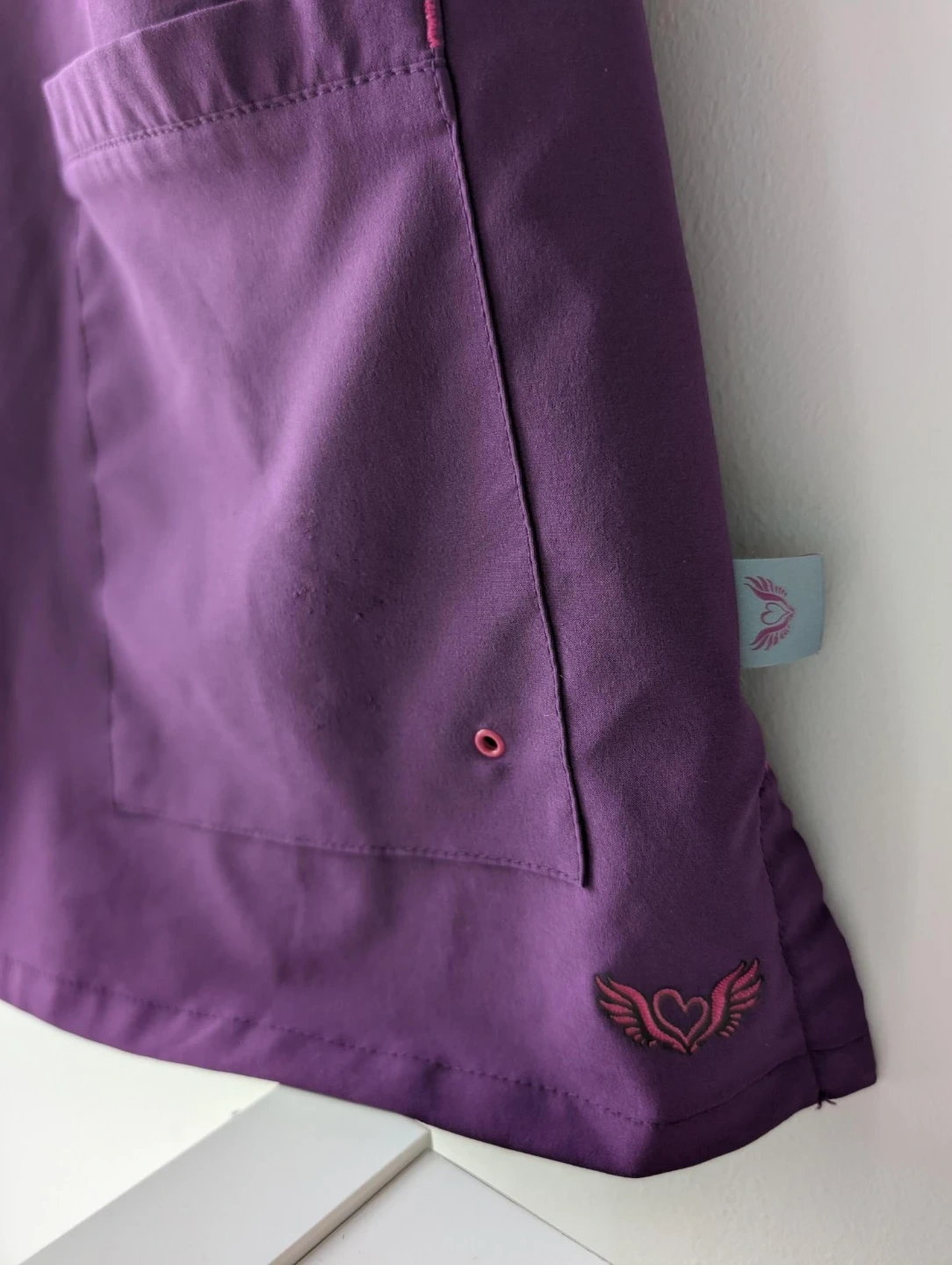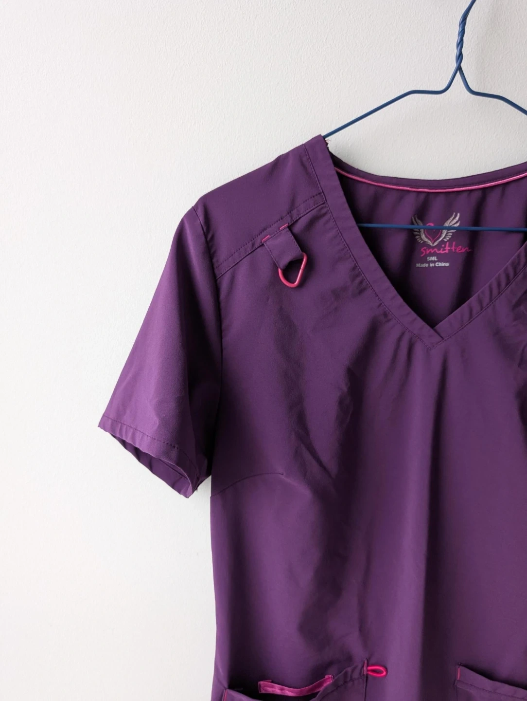This is a Skechers V-neck scrub top in a lovely purple colour. It's a size xs and made in China. It features multiple pockets for practicality and a comfortable fit.