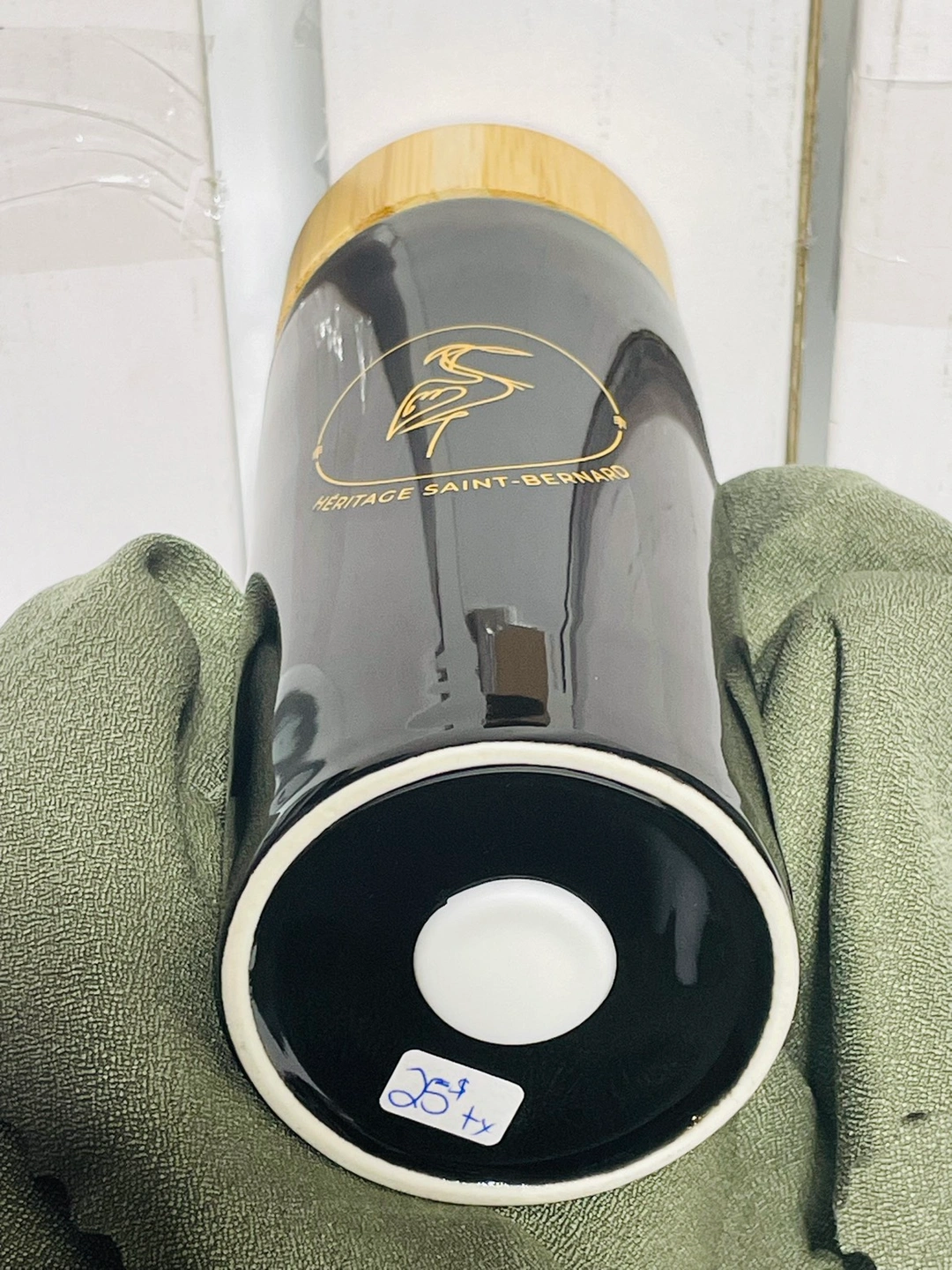 These are ceramic tumblers with bamboo lid. Has Heritage Saint-Bernard logo on side.