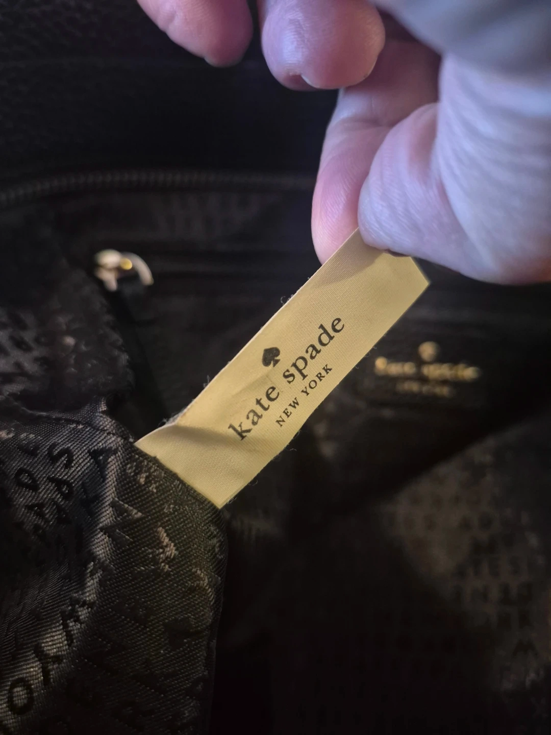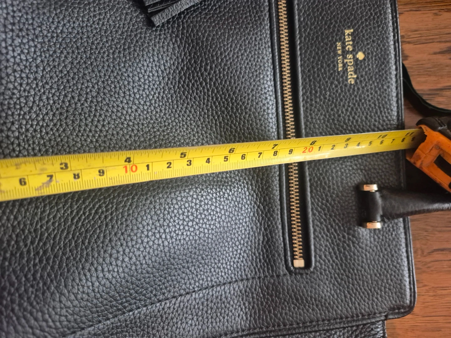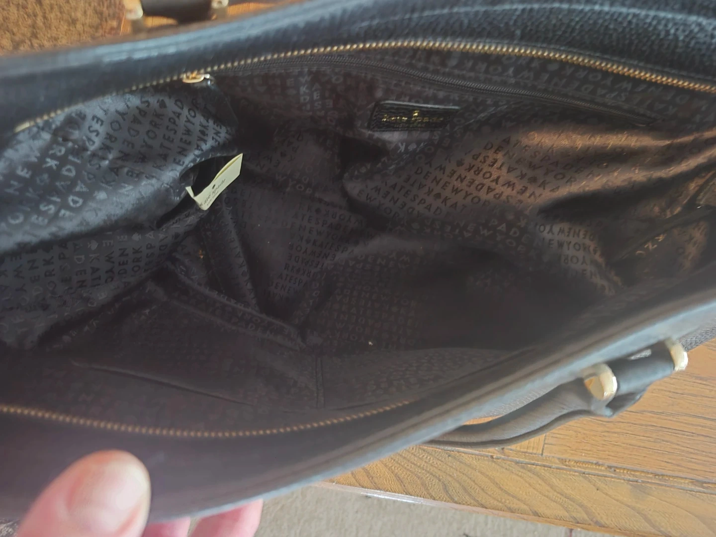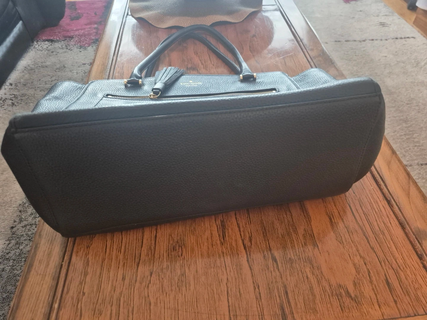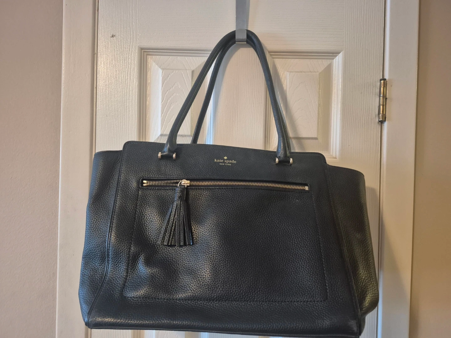 Kate Spade New York black pebbled leather tote bag. It features a zip-top closure and gold-tone hardware. Interior includes multiple pockets for organization. This tote is made of genuine leather.