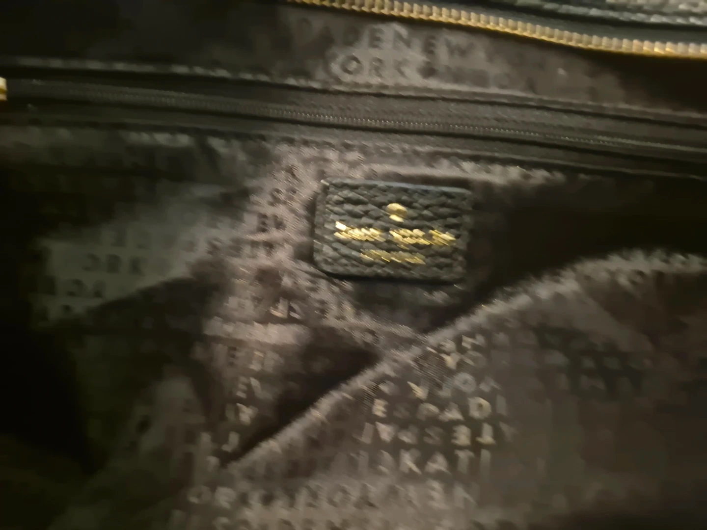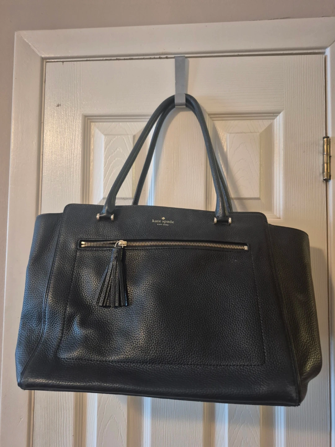 Kate Spade New York black pebbled leather tote bag. It features a zip-top closure and gold-tone hardware. Interior includes multiple pockets for organization. This tote is made of genuine leather.