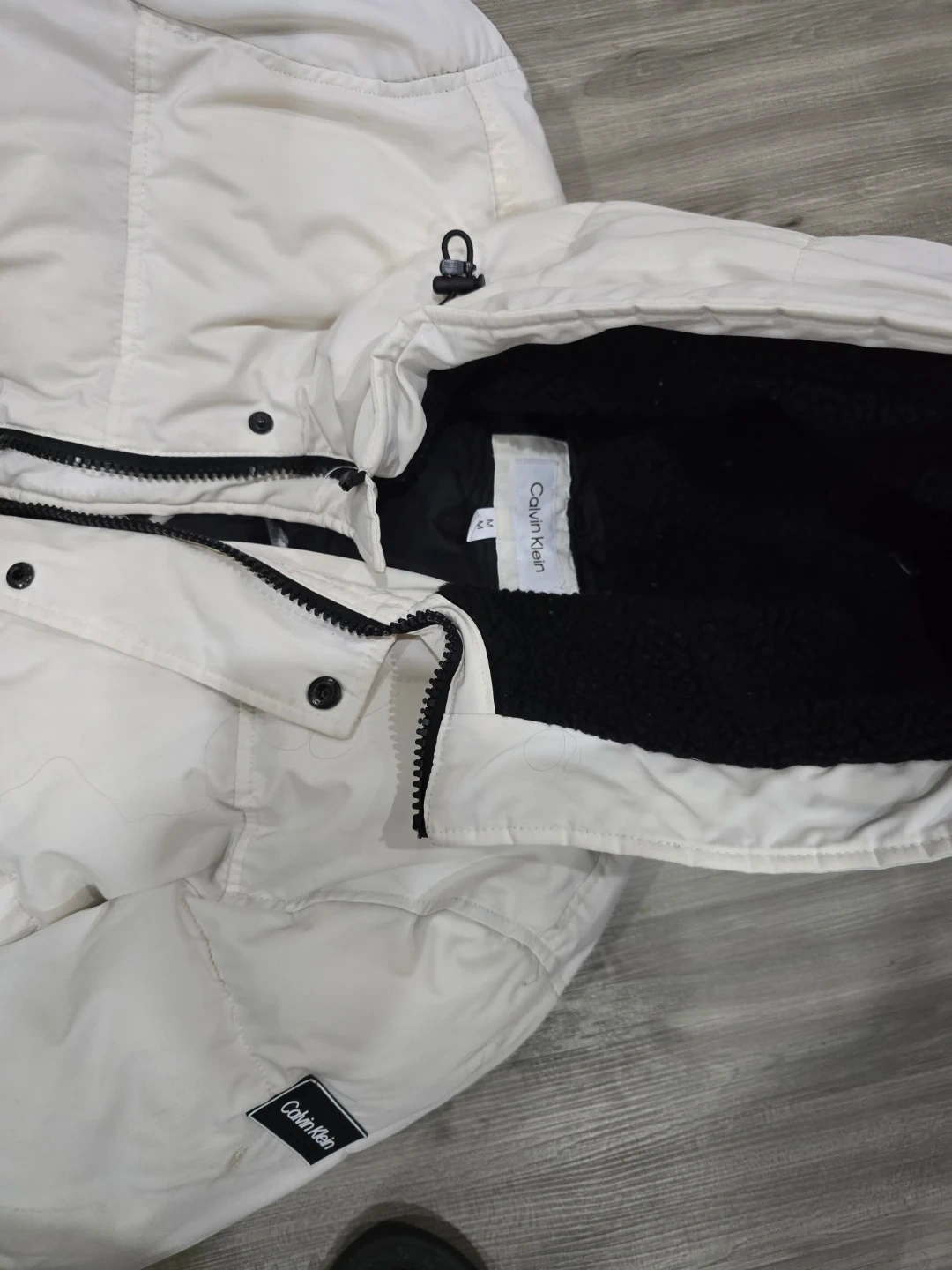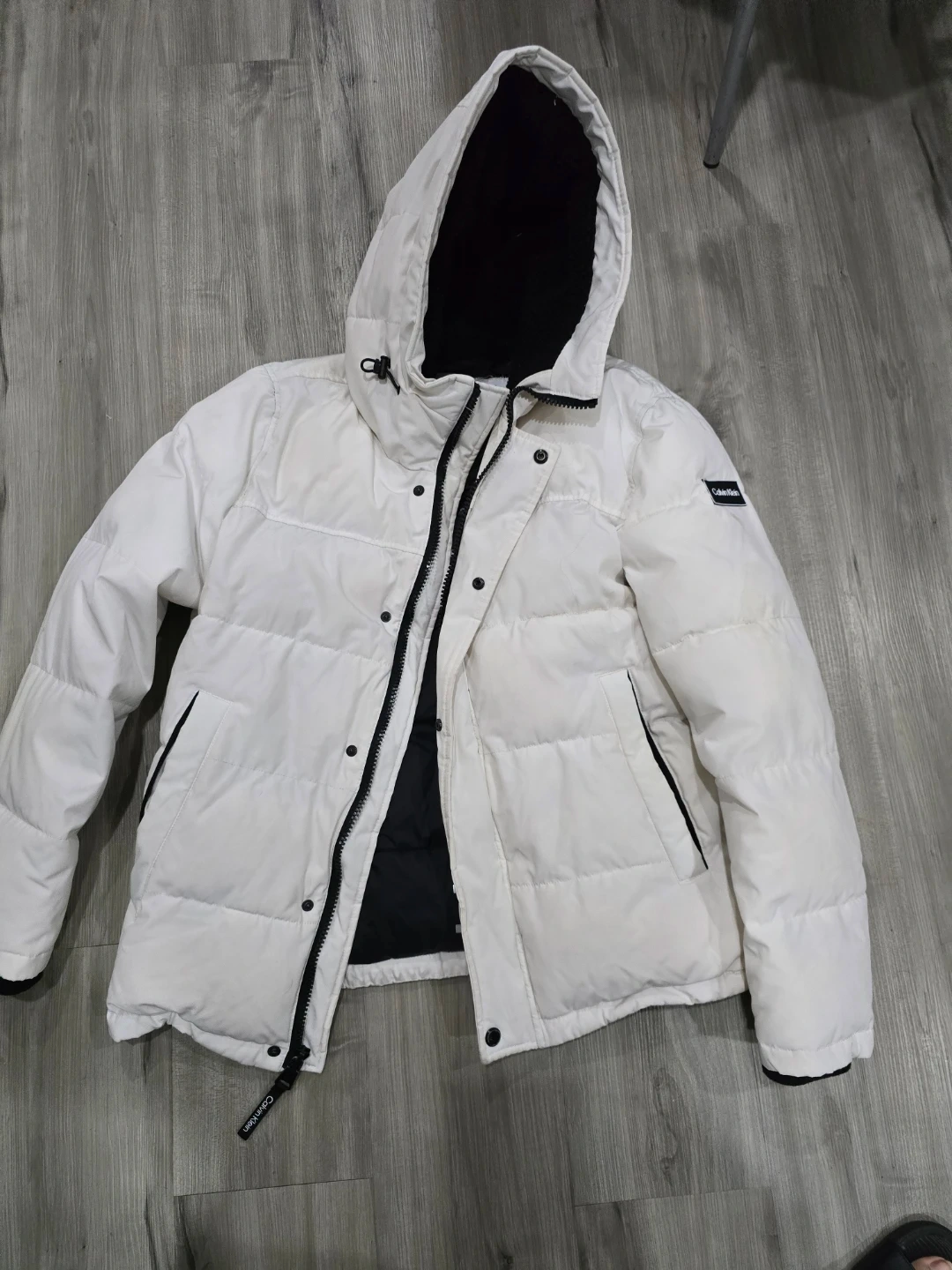 Cozy Calvin Klein puffer jacket in white. It's insulated for warmth and features a zip-up front with snap buttons. The hood is attached and insulated, perfect for cooler weather!
