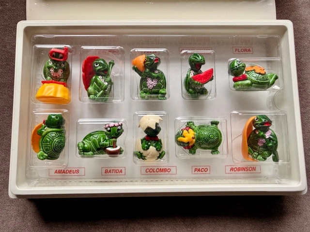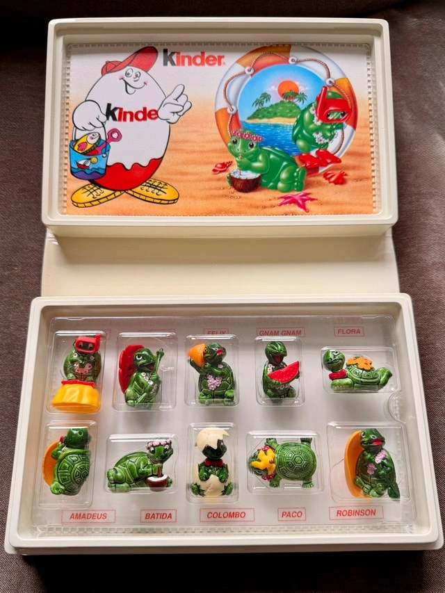 Rare Kinder Surprise set featuring 10 Happy Turtles: Marino, Calipso, Felix, Gnam Gnam, Flora, Amadeus, Batida, Colombo, Paco, and Robinson. Comes in a collectible case. All turtles are unopened. The set might be European. Very good condition, though the case has some small signs of aging. Pickup is at 147 Laird Drive.