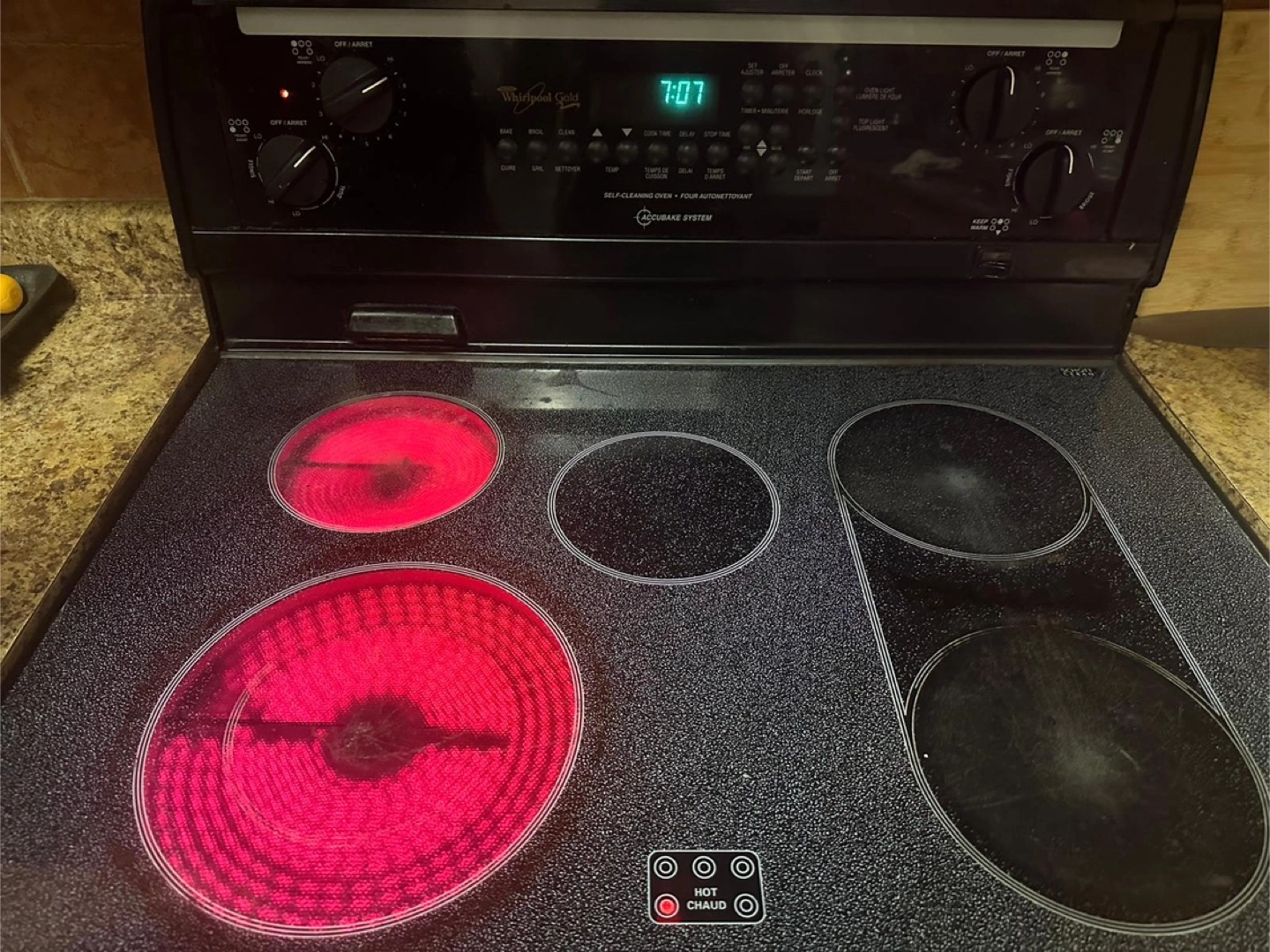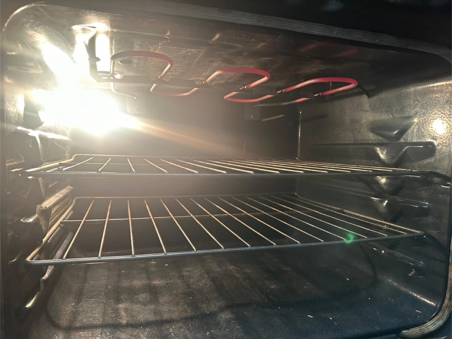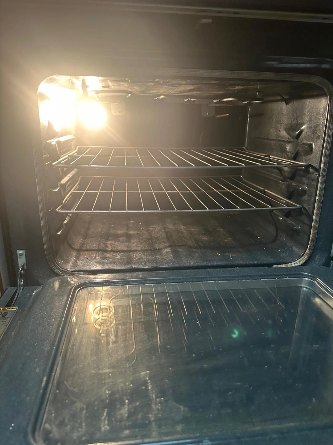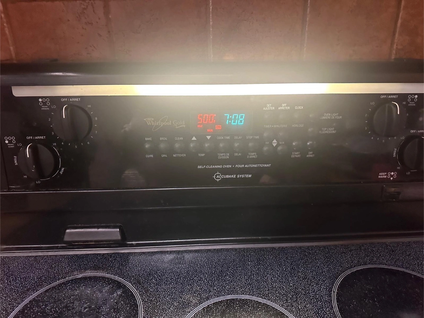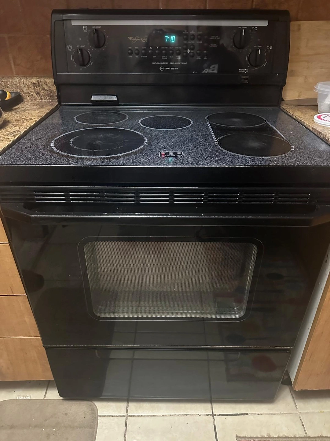 Black electric range. Four burners and a self-cleaning oven. Includes oven racks. Used, but in good condition. The burners on the right side don’t work.