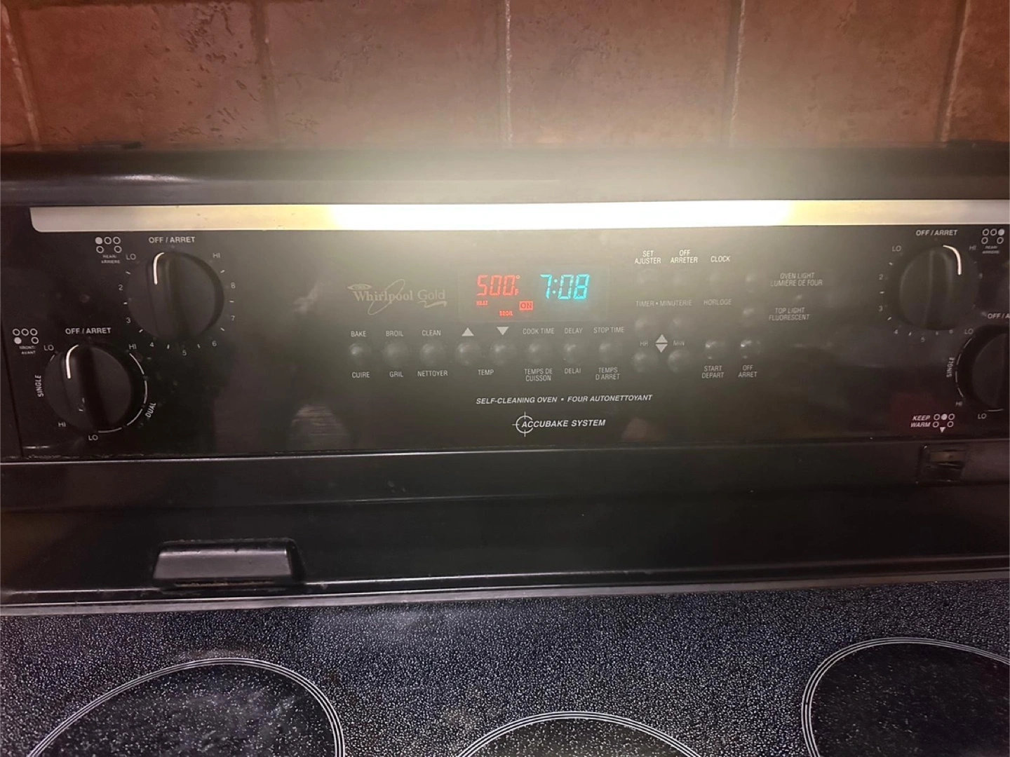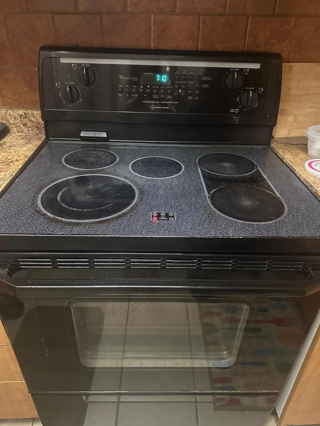 Black electric range. Four burners and a self-cleaning oven. Includes oven racks. Used, but in good condition. The burners on the right side don’t work.
