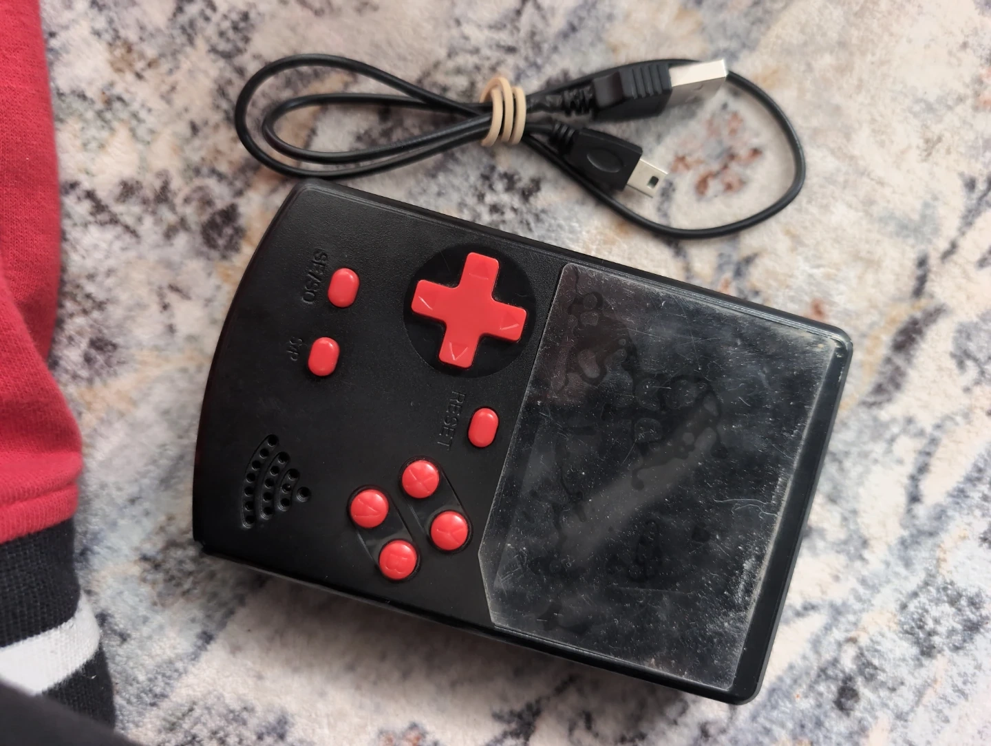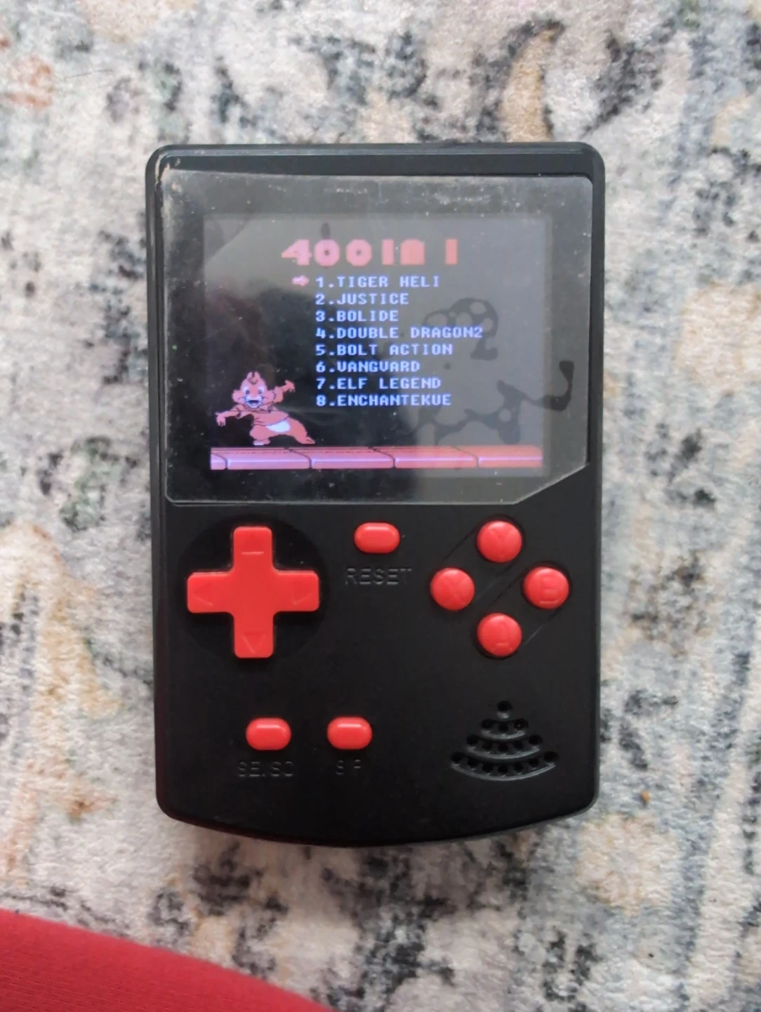 This black handheld game console comes pre-loaded with 400 games. It's a portable gaming device for entertainment. The device is black with red control buttons. It's very good for kids age 5 -15