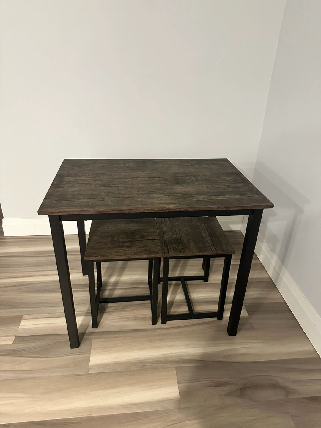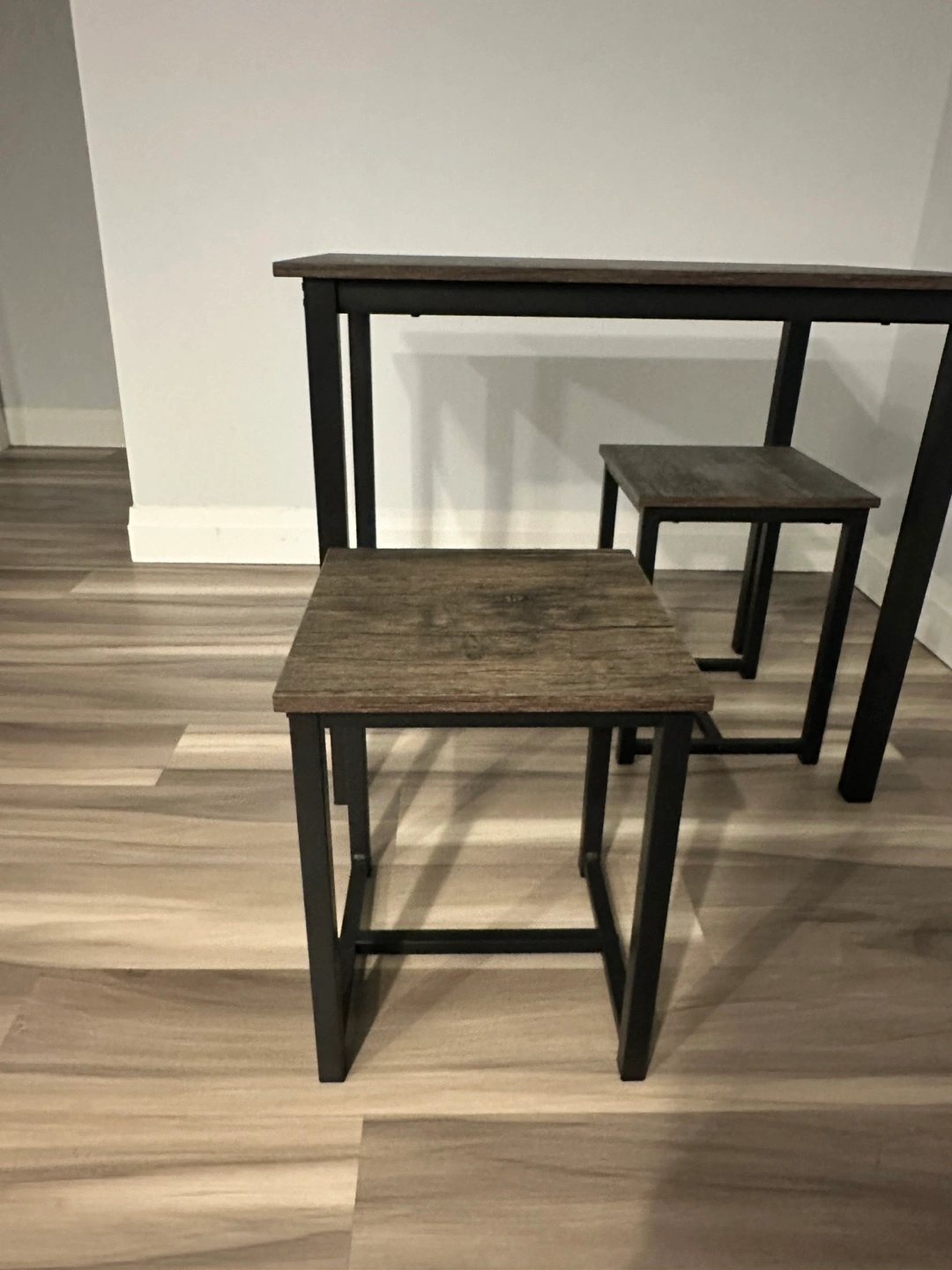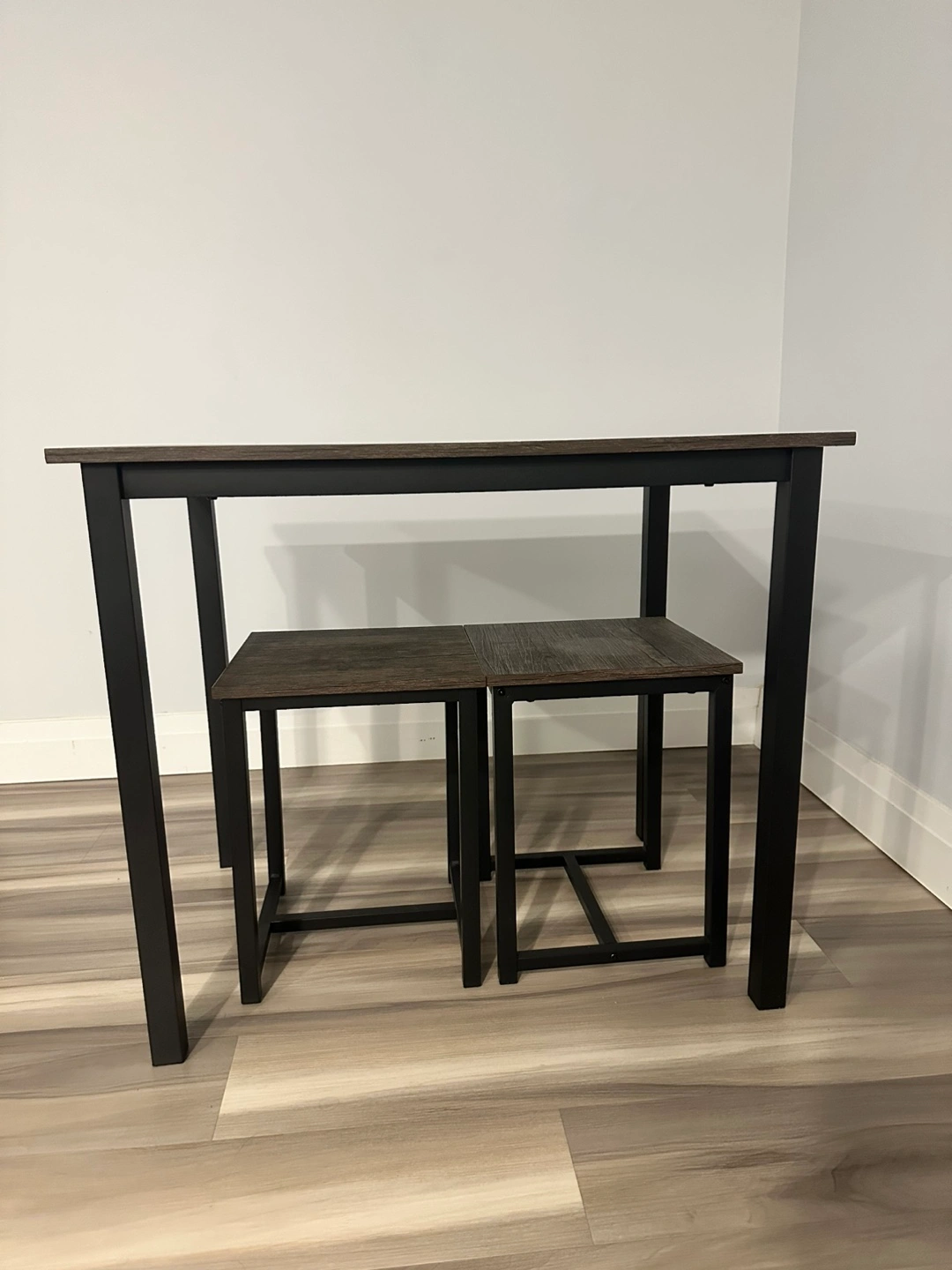 Small gray dining set with table and 2 matching stools. Black metal legs and wood-look top.
