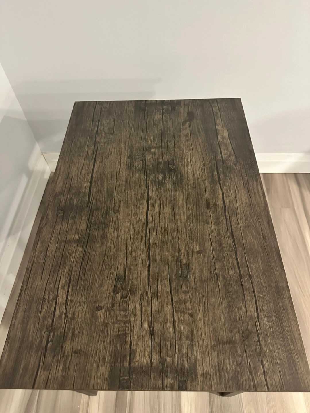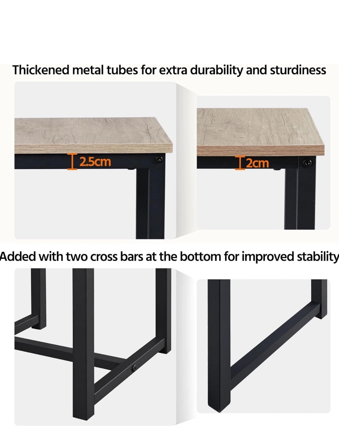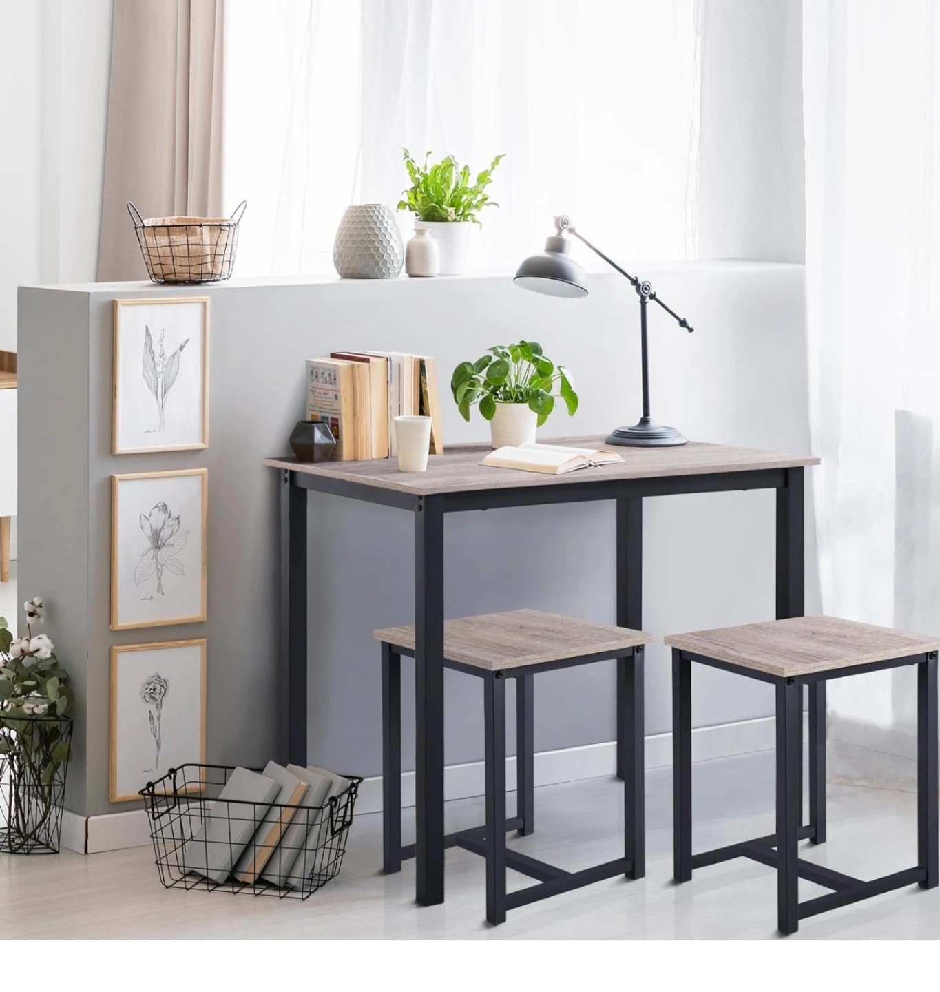 Small gray dining set with table and 2 matching stools. Black metal legs and wood-look top.
