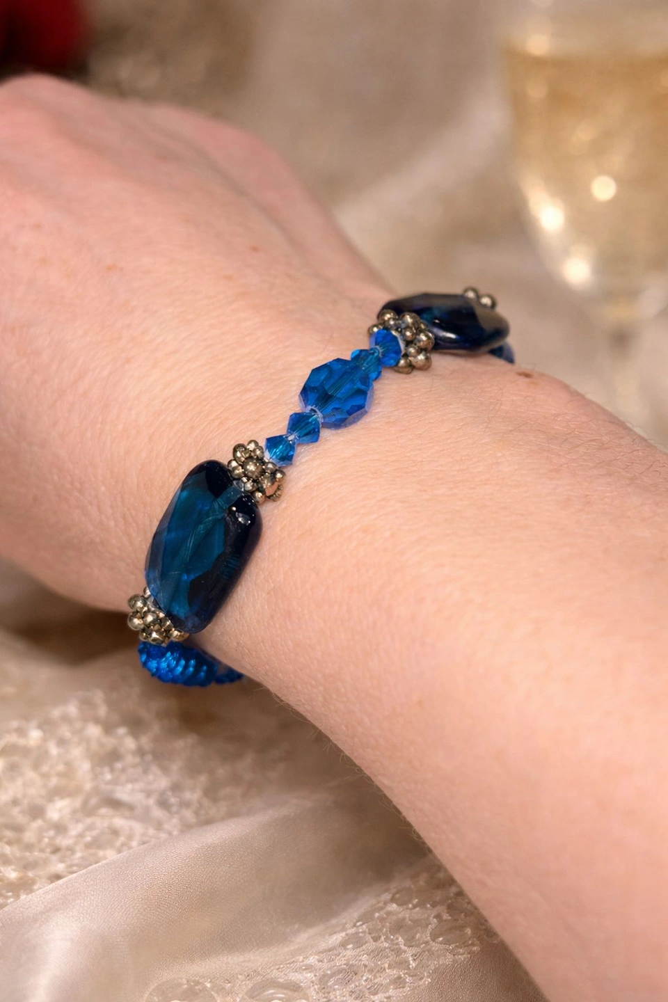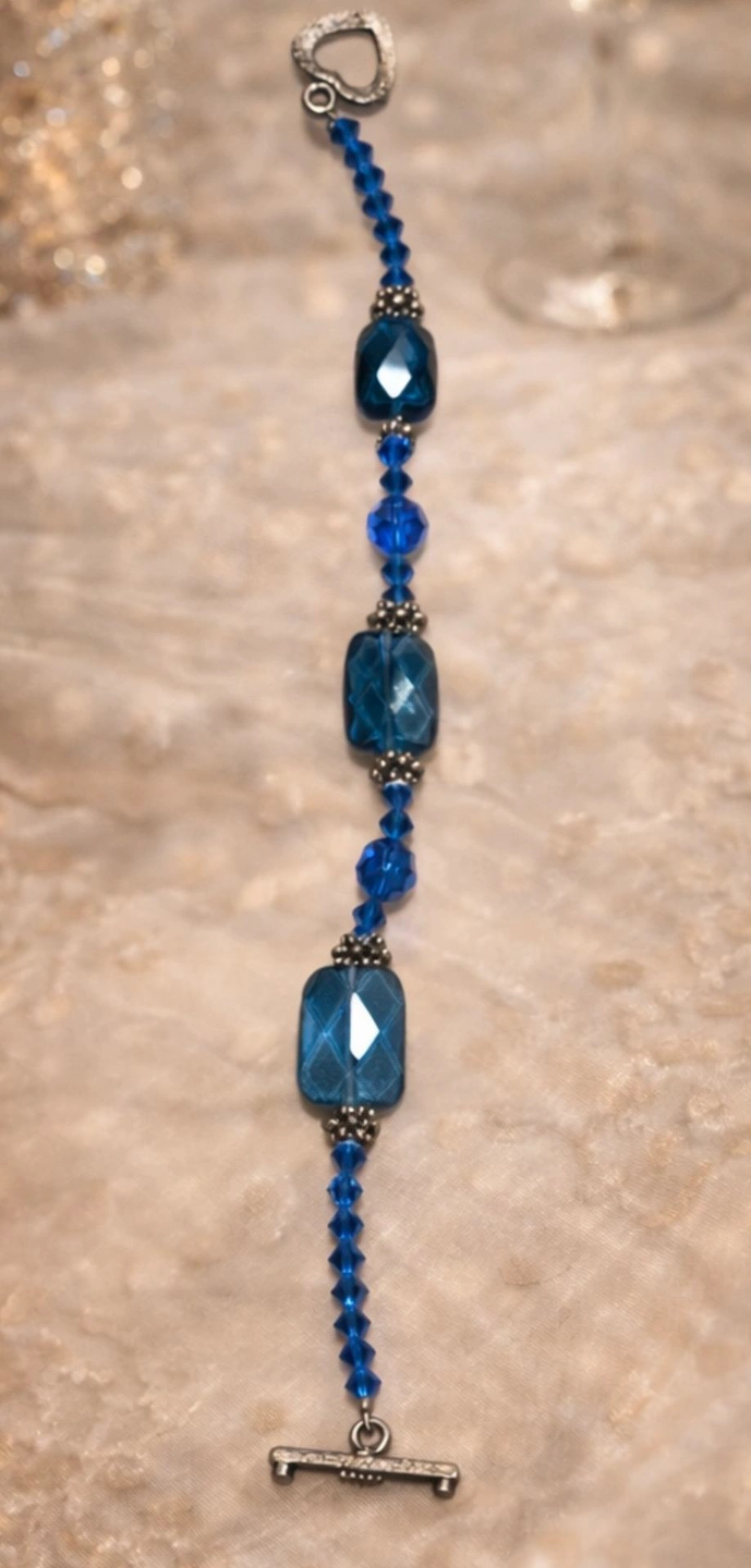 This beautiful handcrafted bracelet features rich, faceted teal-blue glass rectangle beads paired with sparkling royal blue crystal accents and detailed antique silver–tone spacer beads. The combination creates a timeless, elegant look with just the right amount of shimmer. Excellent condition. Finished with an ornate silver-tone toggle clasp, this bracelet feels secure, lightweight, and comfortable on the wrist. The design is symmetrical and thoughtfully assembled, giving it a refined artisan quality that makes it perfect for both everyday wear and special occasions. Handmade, one-of-a-kind piece. Faceted teal-blue glass rectangle beads. Blue crystal accent beads. Antique silver-tone spacer beads. Decorative toggle clasp closure. Measures approximately 5 inches when laid flat. Best suited for petite to slim adult wrists. Shown worn on an adult wrist for reference. Please measure wrist for best fit.