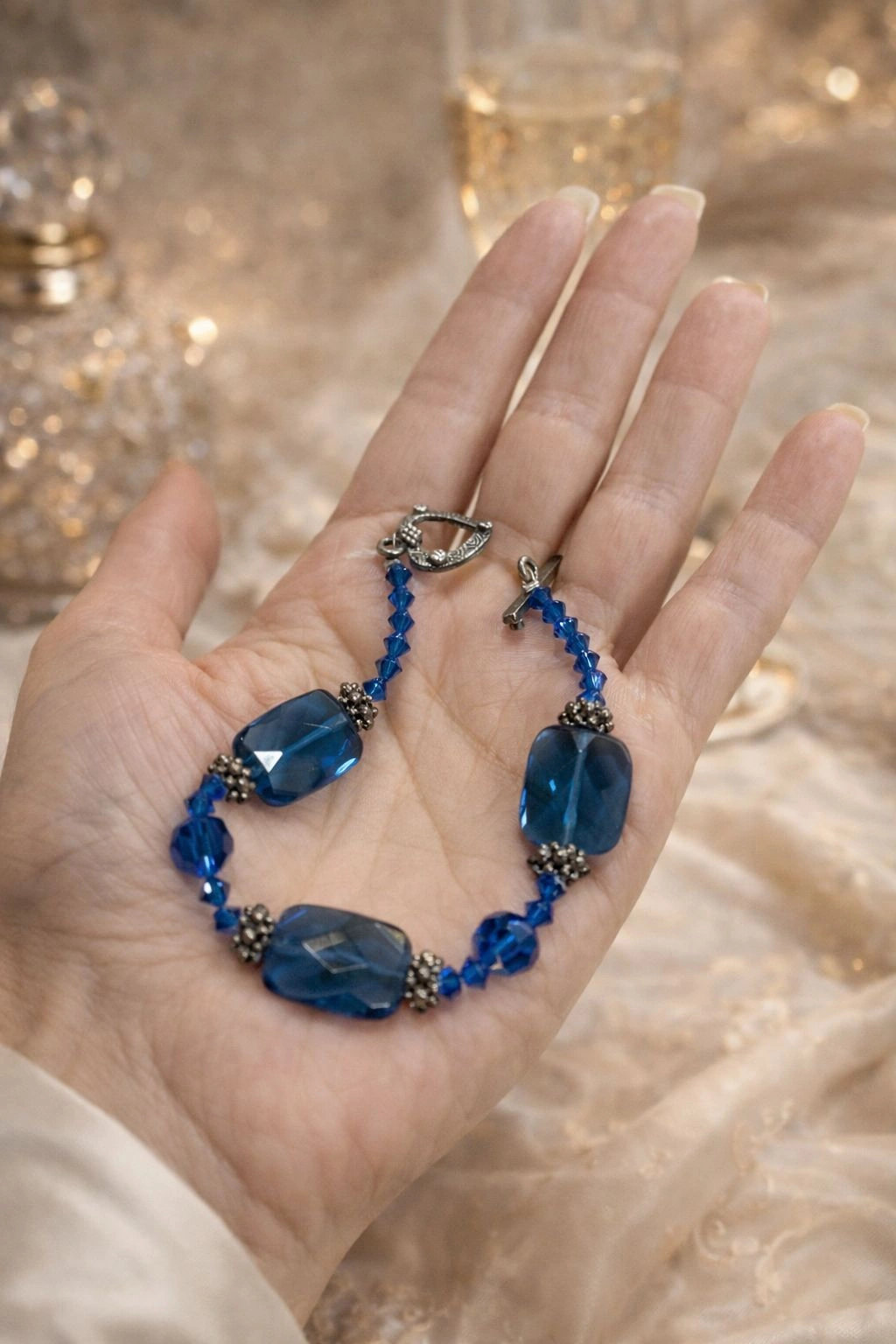 This beautiful handcrafted bracelet features rich, faceted teal-blue glass rectangle beads paired with sparkling royal blue crystal accents and detailed antique silver–tone spacer beads. The combination creates a timeless, elegant look with just the right amount of shimmer. Excellent condition. Finished with an ornate silver-tone toggle clasp, this bracelet feels secure, lightweight, and comfortable on the wrist. The design is symmetrical and thoughtfully assembled, giving it a refined artisan quality that makes it perfect for both everyday wear and special occasions. Handmade, one-of-a-kind piece. Faceted teal-blue glass rectangle beads. Blue crystal accent beads. Antique silver-tone spacer beads. Decorative toggle clasp closure. Measures approximately 5 inches when laid flat. Best suited for petite to slim adult wrists. Shown worn on an adult wrist for reference. Please measure wrist for best fit.