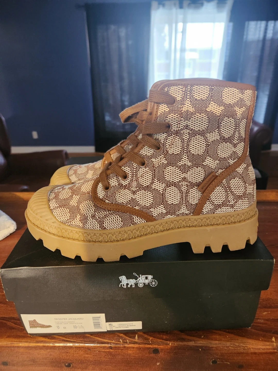 Coach Trooper Jacquard boots in a brown signature print. These boots have a durable lug sole and lace-up closure. Includes original box.