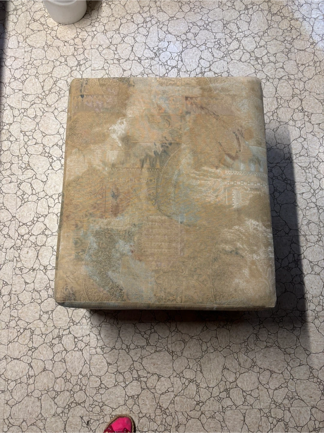 Vintage 1990s ottoman with a beige fabric and subtle geometric/circle pattern. Has that classic older look—would fit well with vintage, retro, or cozy decor styles.
