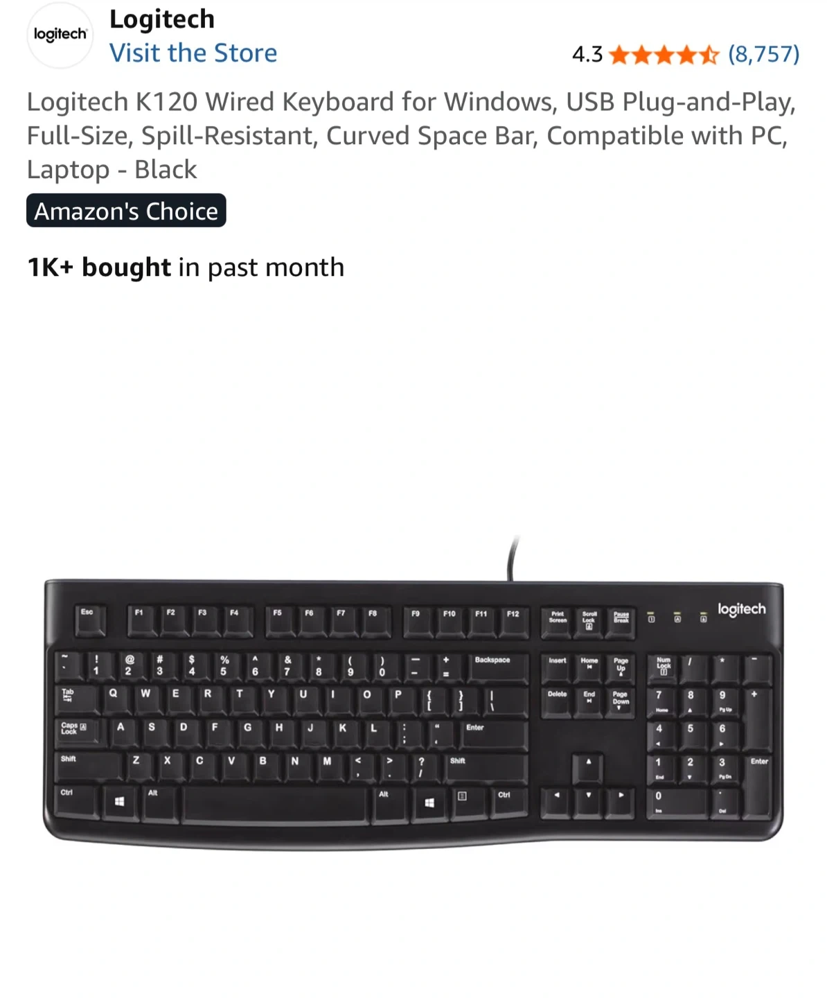 This is a Logitech K120 wired keyboard in black. It features a full-size layout with a curved space bar for comfortable typing. It's USB plug-and-play for easy setup.