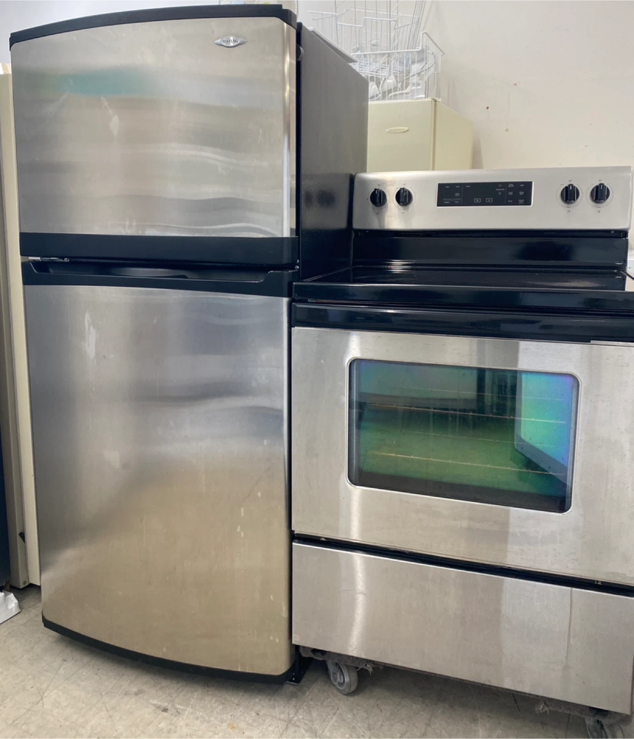 Stainless Maytag Fridge & Whirlpool Stove, clean & fully functional. Fridge measurements are 29.5” wide, 65” high. Stove is 30” black and stainless smooth-top. Asking $950. for the pair. 204.663.9988.