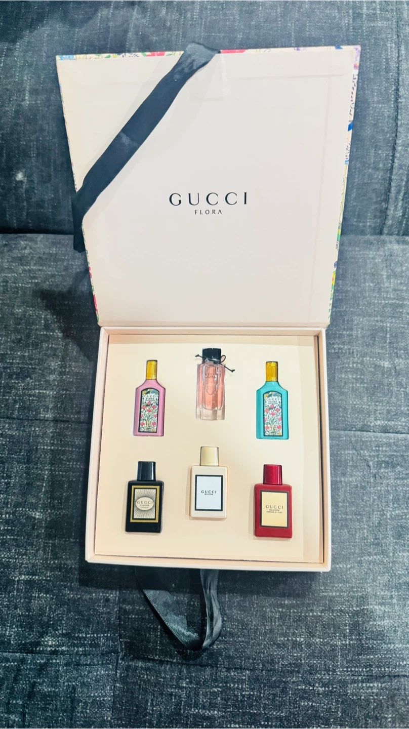 This Gucci Flora set includes six miniature perfume bottles. Each bottle has a unique floral design. It's a lovely collection for trying different scents.