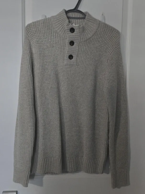 This light grey sweater has a mock neck with three button details. It's made with a waffle knit texture. This cozy sweater is perfect for cooler weather!