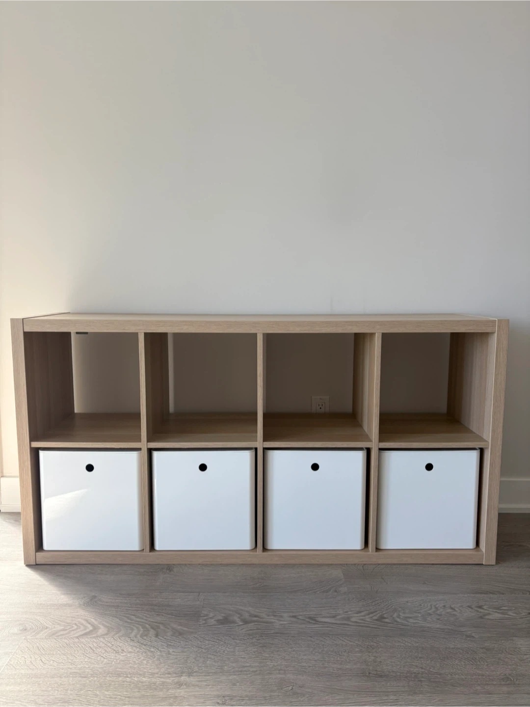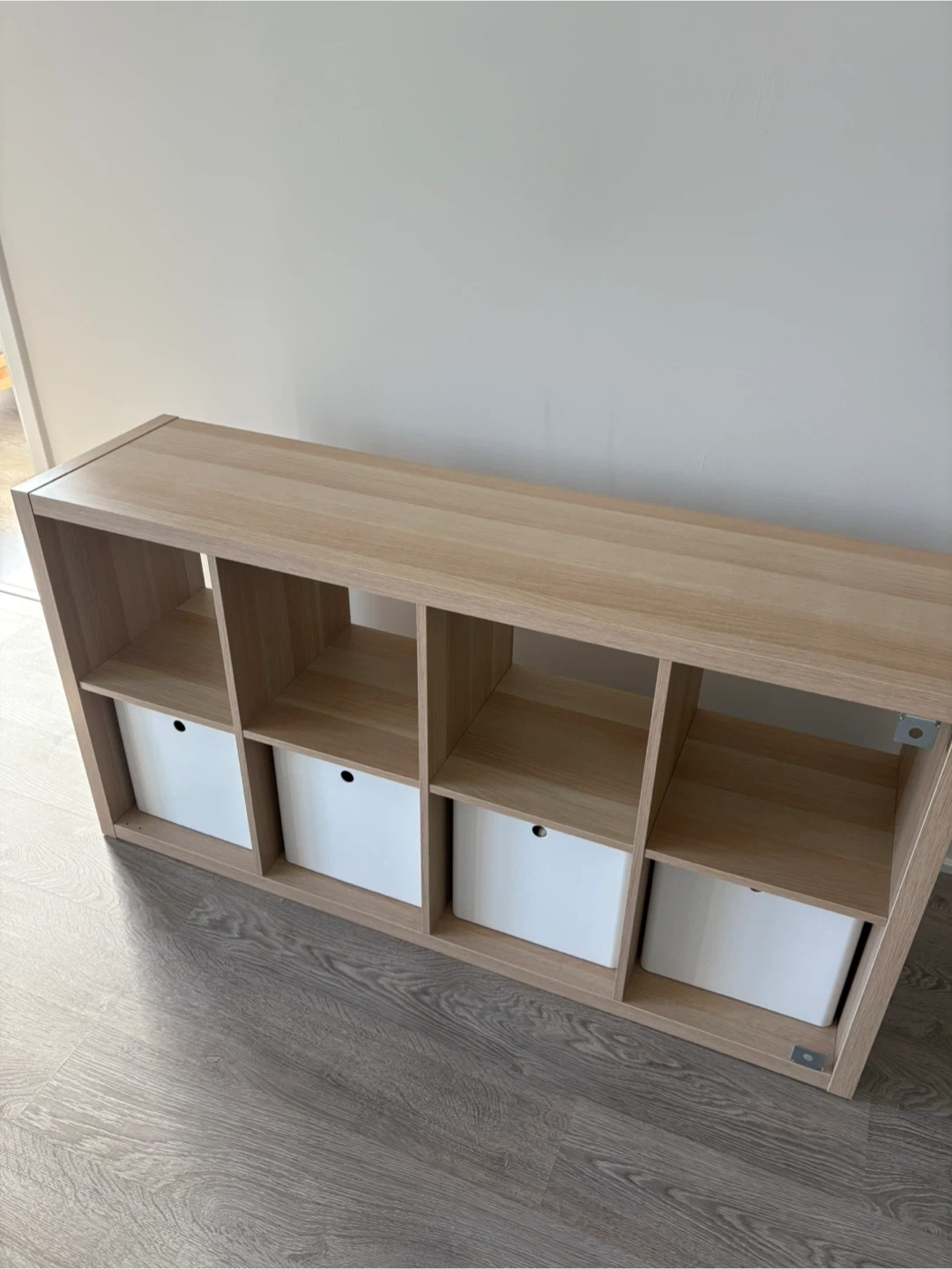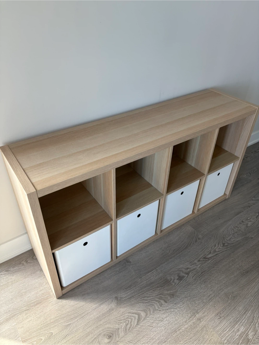 Selling a IKEA KALLAX shelving unit with 4 white KUGGIS storage boxes with lids.