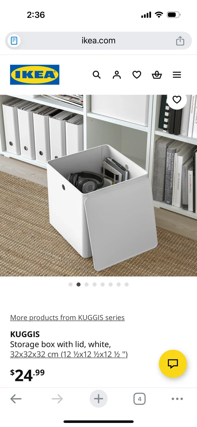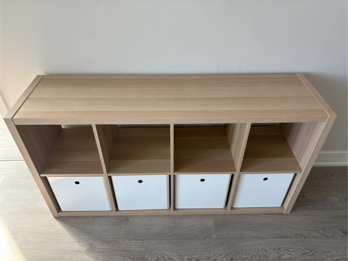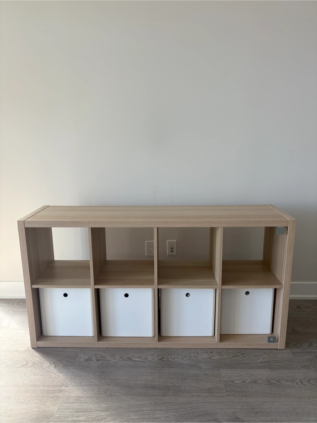 Selling a IKEA KALLAX shelving unit with 4 white KUGGIS storage boxes with lids.