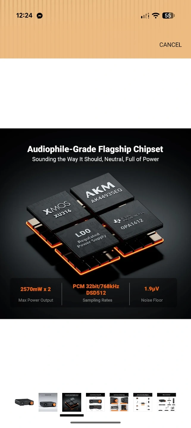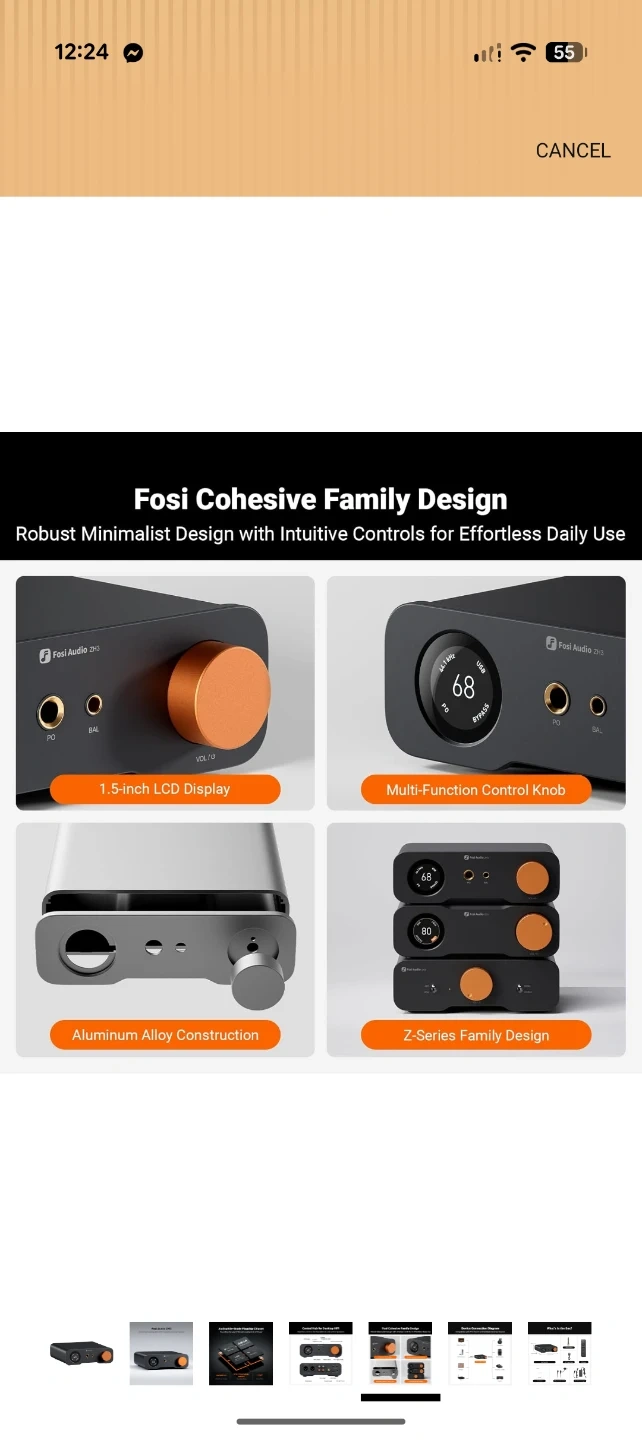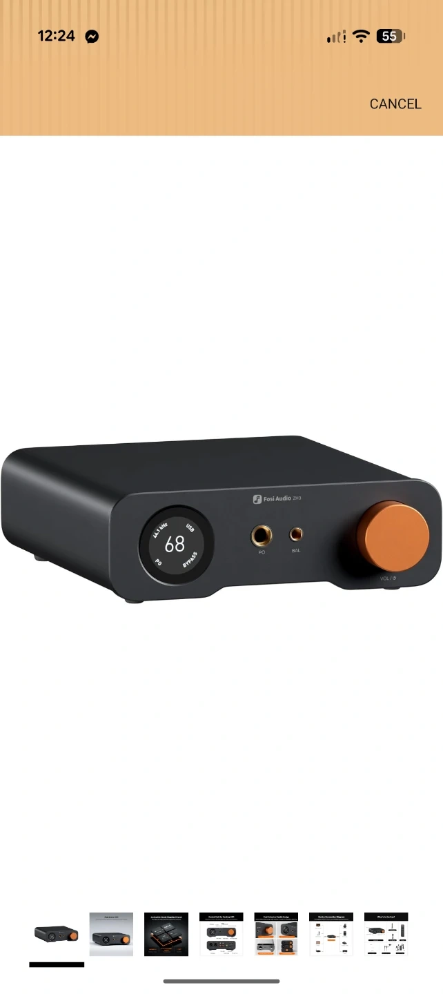 This is the Fosi Audio ZH3, an all-in-one desktop HiFi DAC/headphone amplifier/preamp. It features a 1.5-inch LCD display and a multi-function control knob. The unit has aluminum alloy construction and supports PCM 32bit/768kHz and DSD512 sampling rates. It offers 2570mW x 2 max power output.