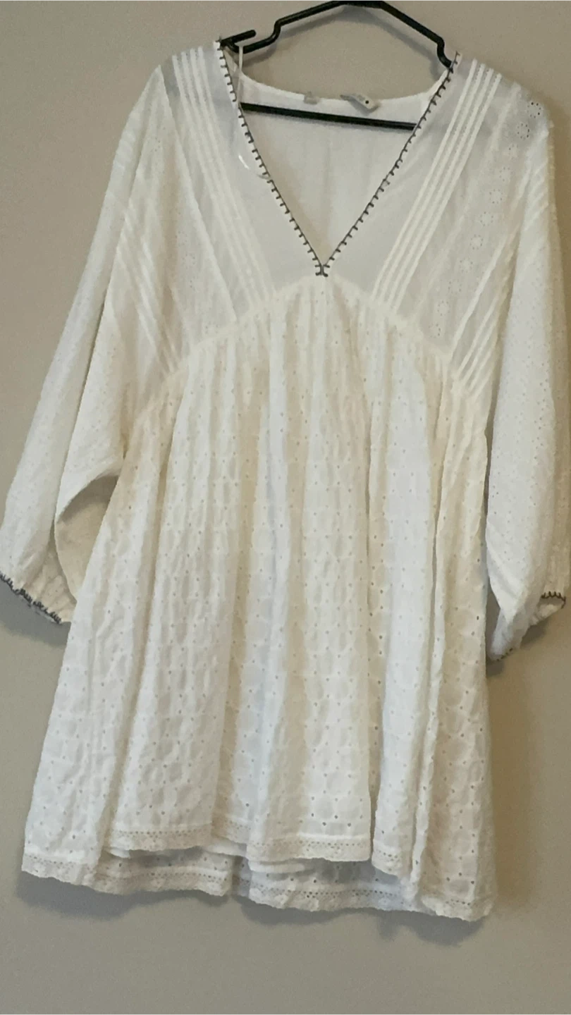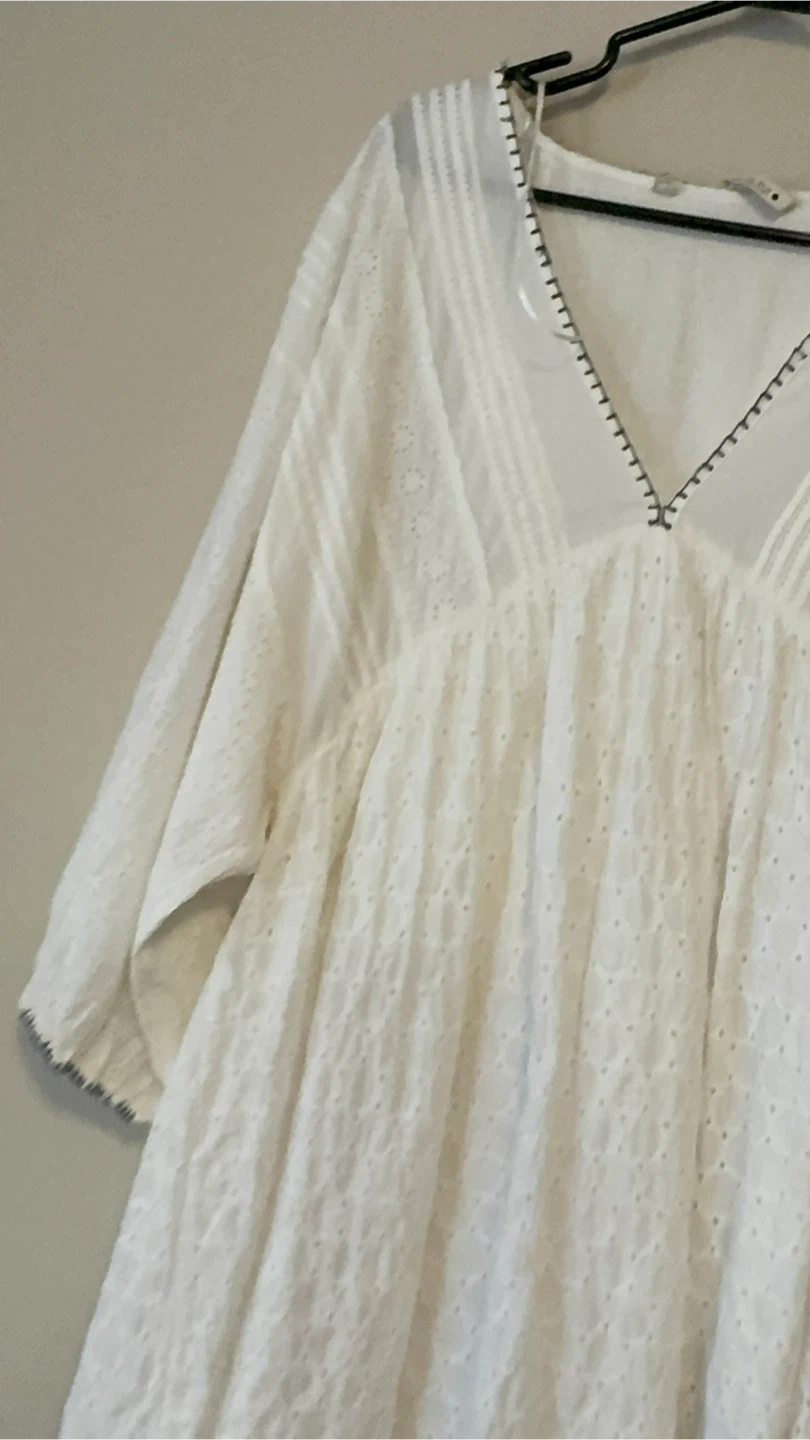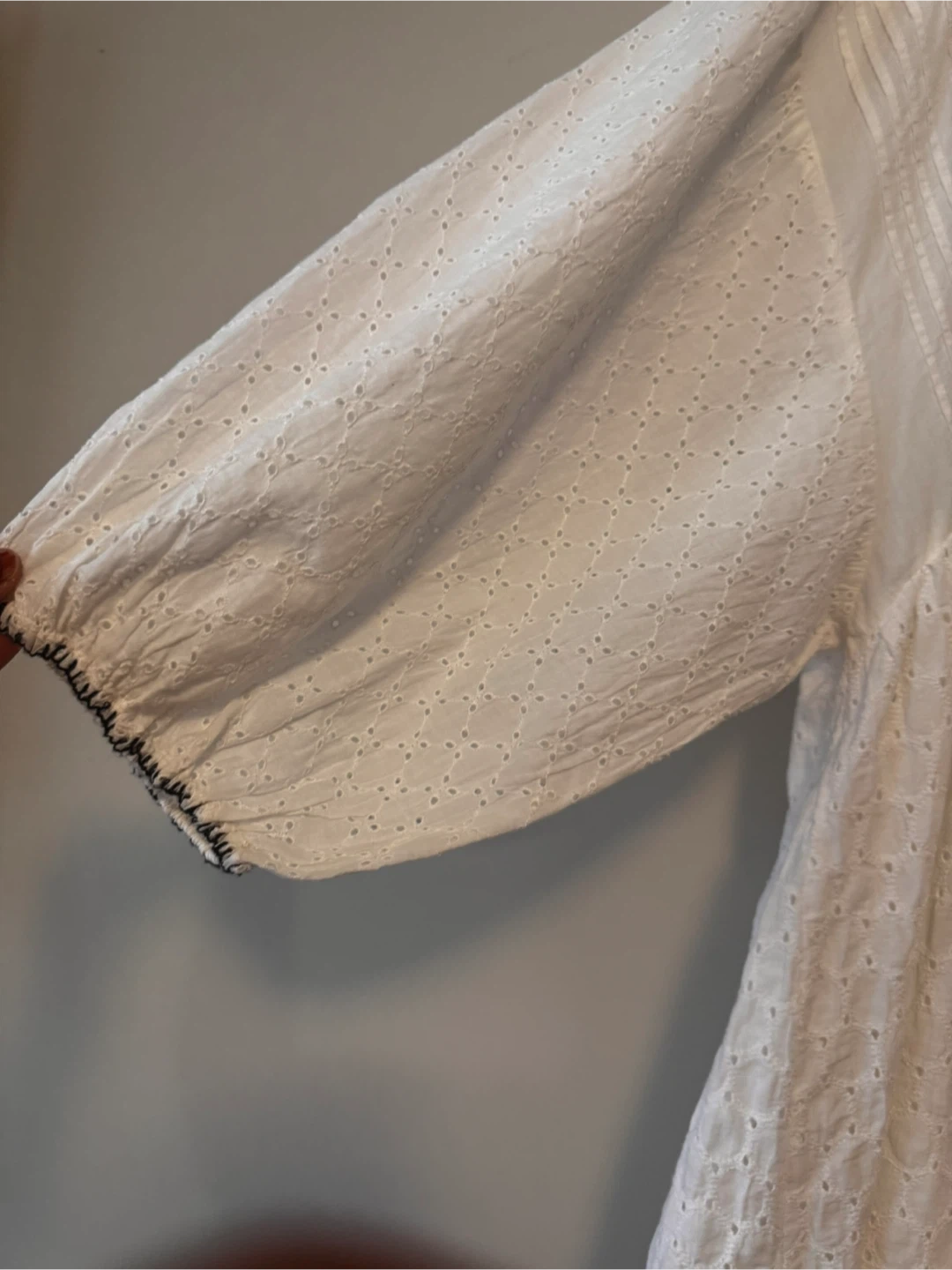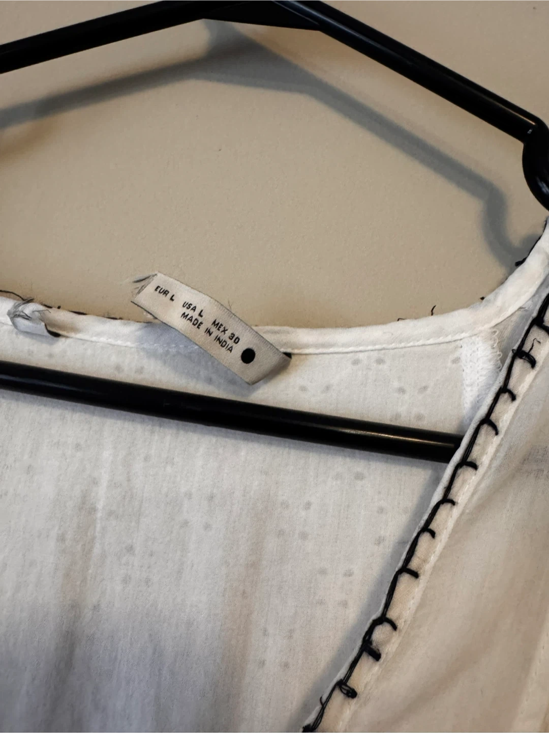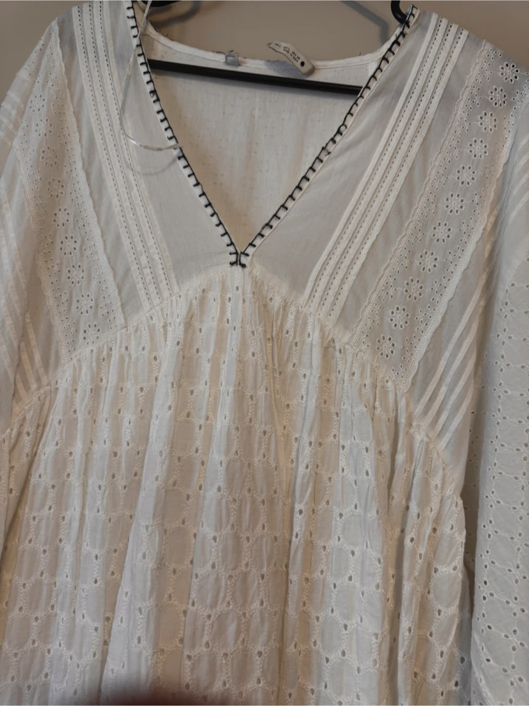 Selling a lovely Zara blouse in a size large! It's a beautiful white eyelet material, perfect for summer. The blouse features a V-neck design with delicate stitching, making it a stylish and comfortable addition to your wardrobe