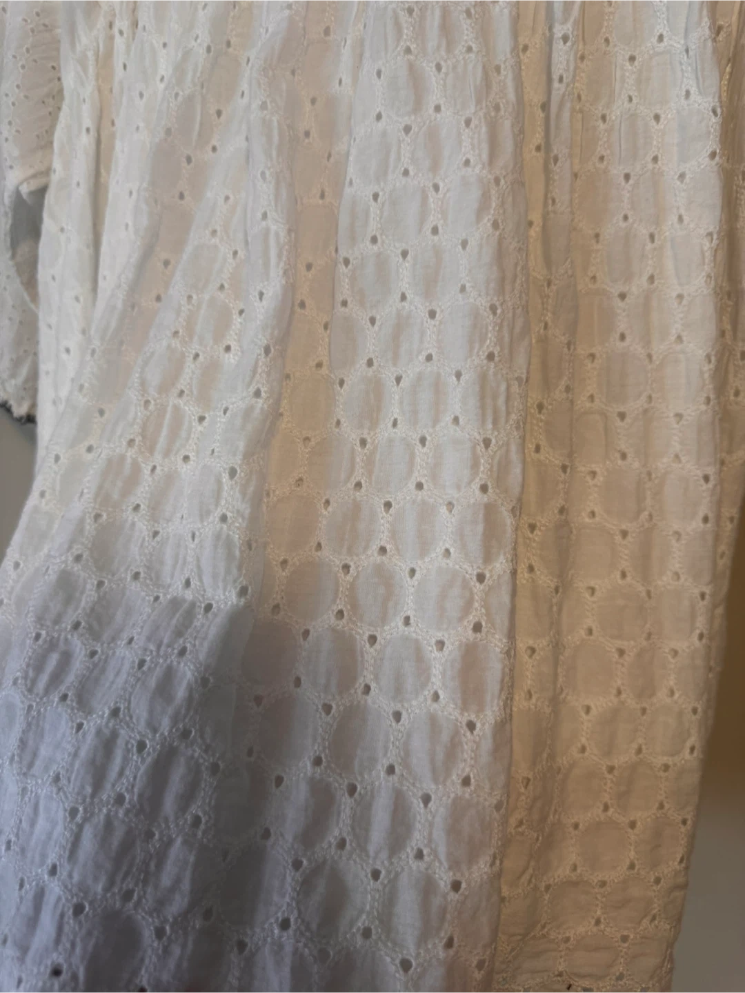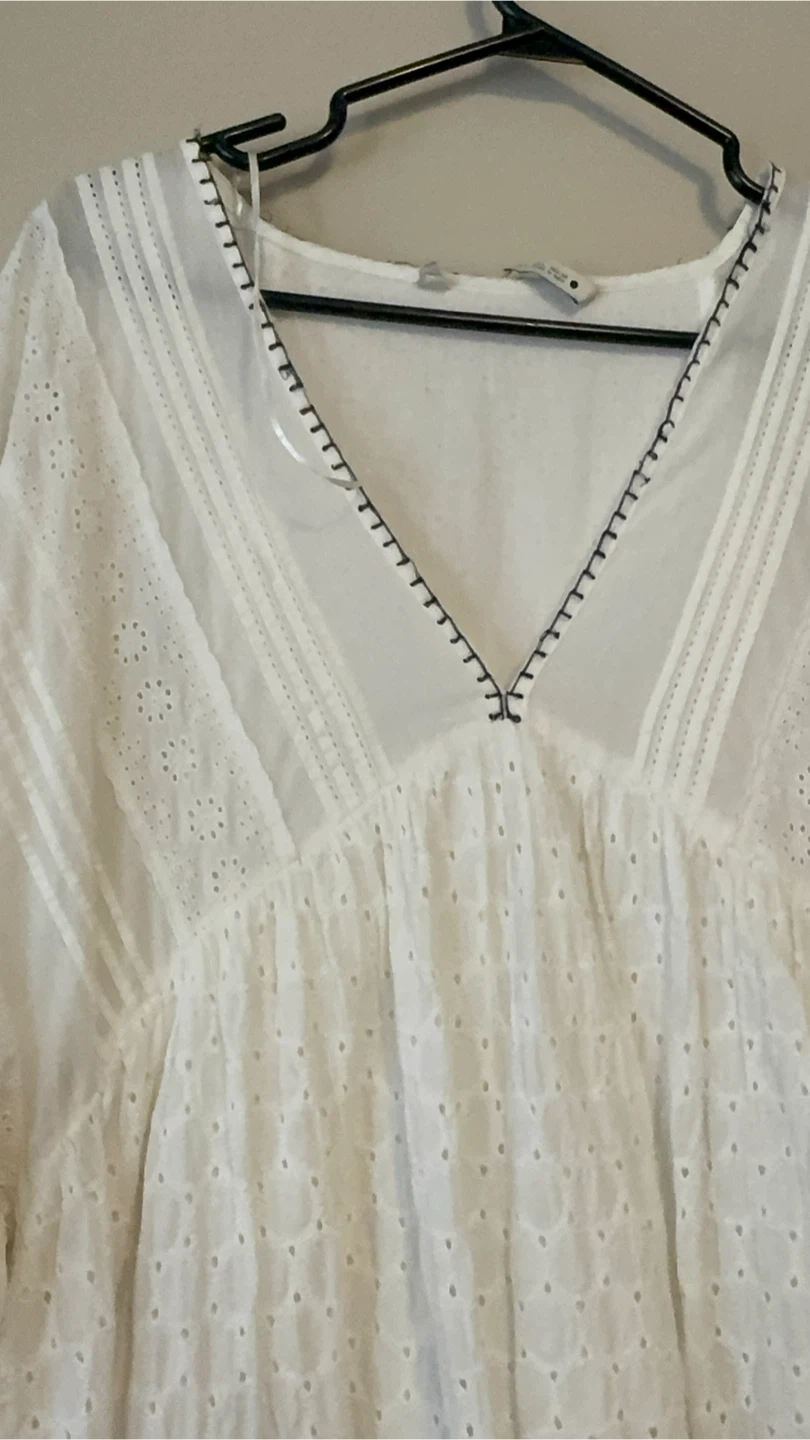 Selling a lovely Zara blouse in a size large! It's a beautiful white eyelet material, perfect for summer. The blouse features a V-neck design with delicate stitching, making it a stylish and comfortable addition to your wardrobe