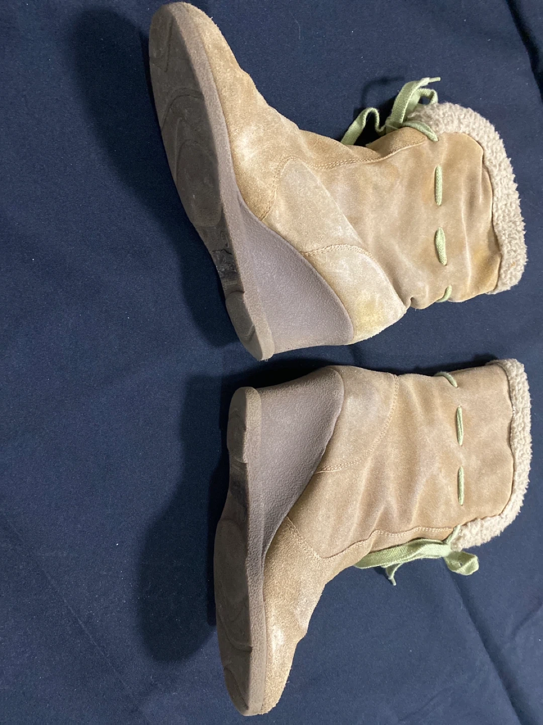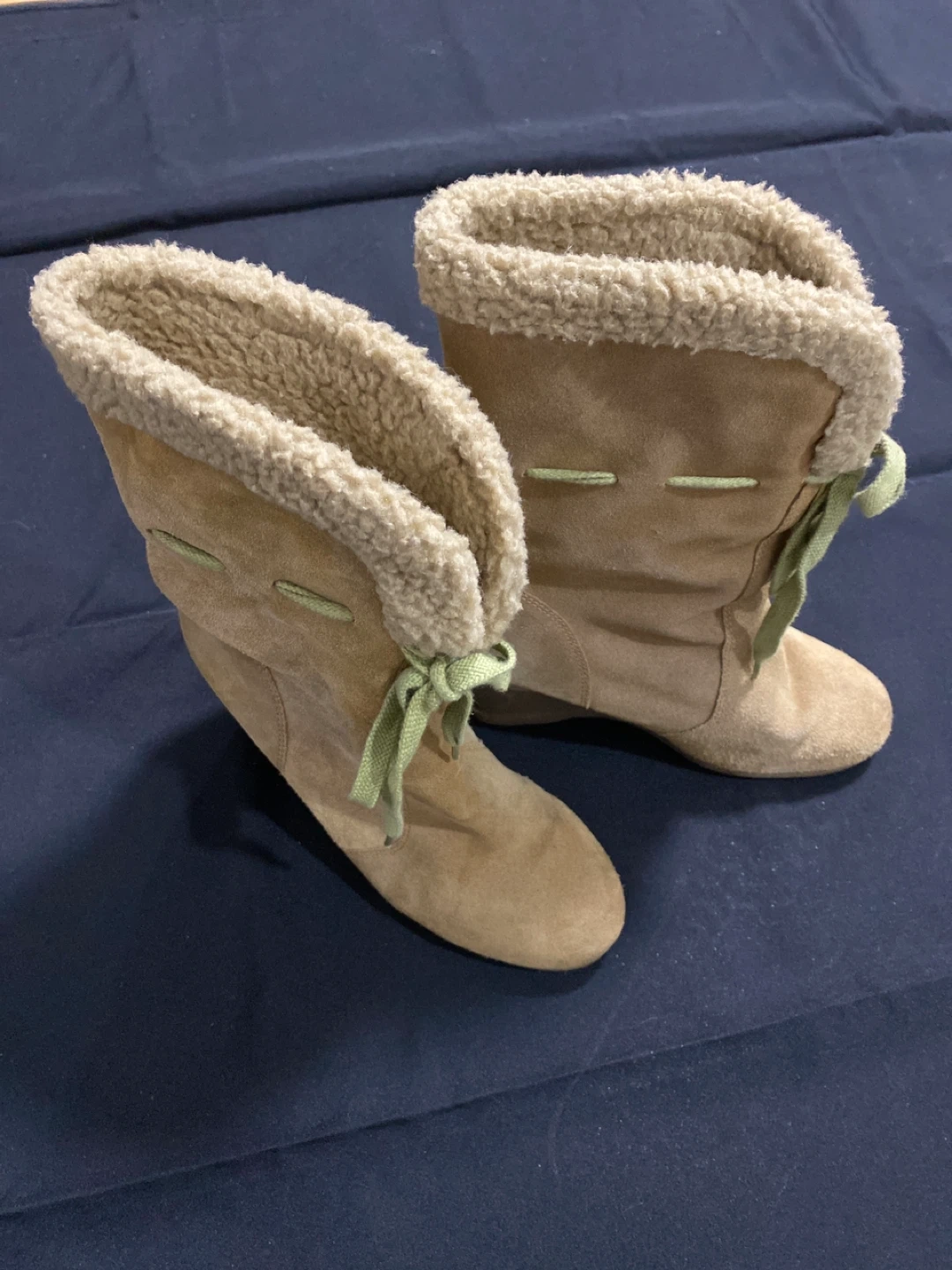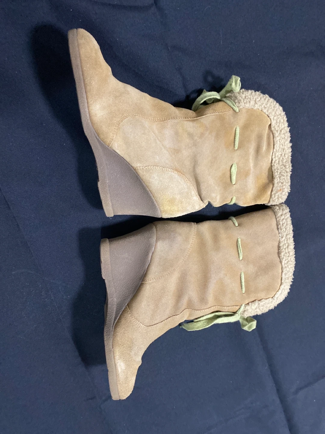 These tan wedge ankle boots are a stylish addition to any wardrobe! Brand diba. They feature a comfortable wedge heel and a cozy faux fur trim. Perfect for adding a touch of flair to your everyday look.