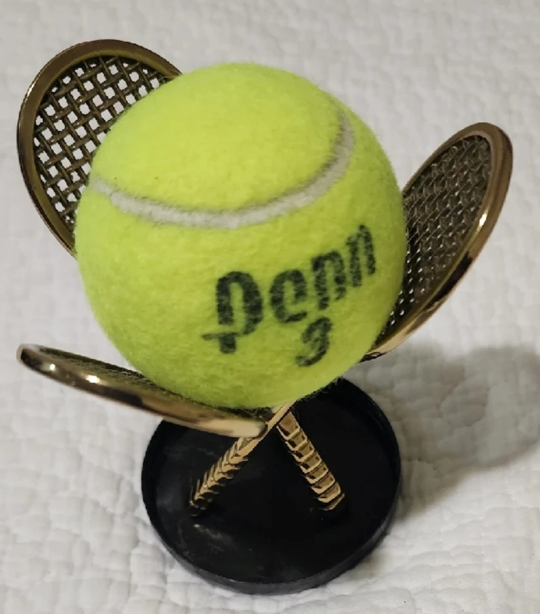 This is a decorative brass tennis ball display stand .Perfect display for desk or shelf!