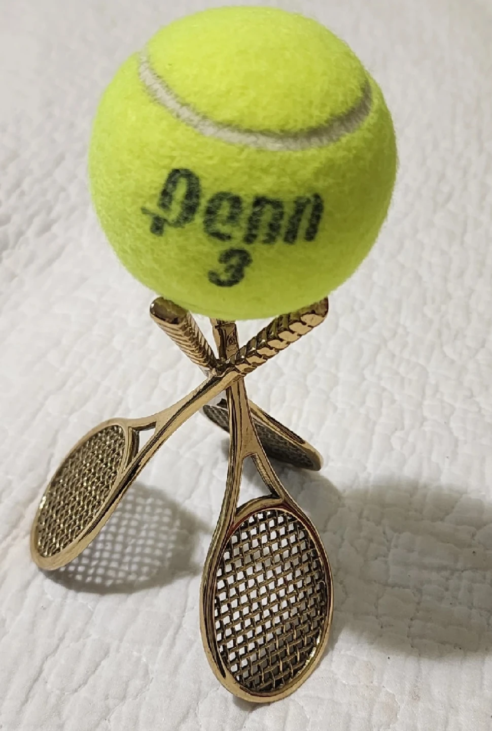This is a decorative brass tennis ball display stand .Perfect display for desk or shelf!