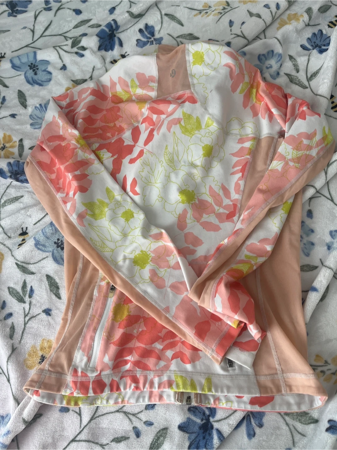 Lightweight zip-up jacket with a colourful floral print and peach-coloured panels. It has zippered pockets and a stand-up collar. Perfect for light outdoor activities or as a layering piece. Pick up cash only