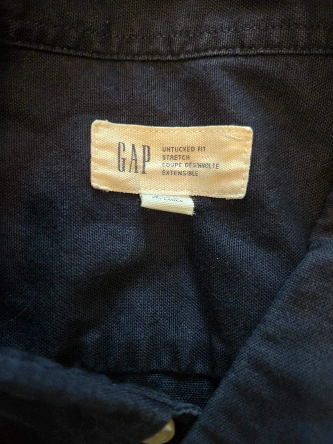 Here's a gently used GAP Untucked Fit Stretch shirt in navy blue. It's a comfortable and versatile shirt, perfect for casual wear. The stretch fabric makes it easy to move around in. It's in great condition and ready for a new home!