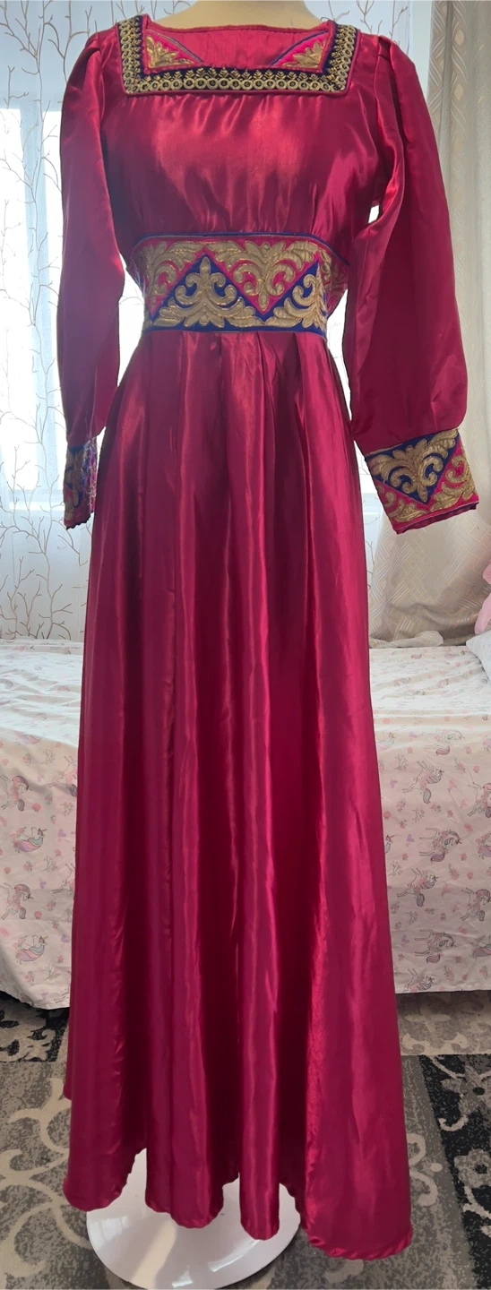 Flowy fuchsia satin kaftan dress with intricate gold and blue embroidery on the neckline and cuffs. It features long puff sleeves and a cinched waist for a flattering silhouette. Perfect for special occasions or festive gatherings!