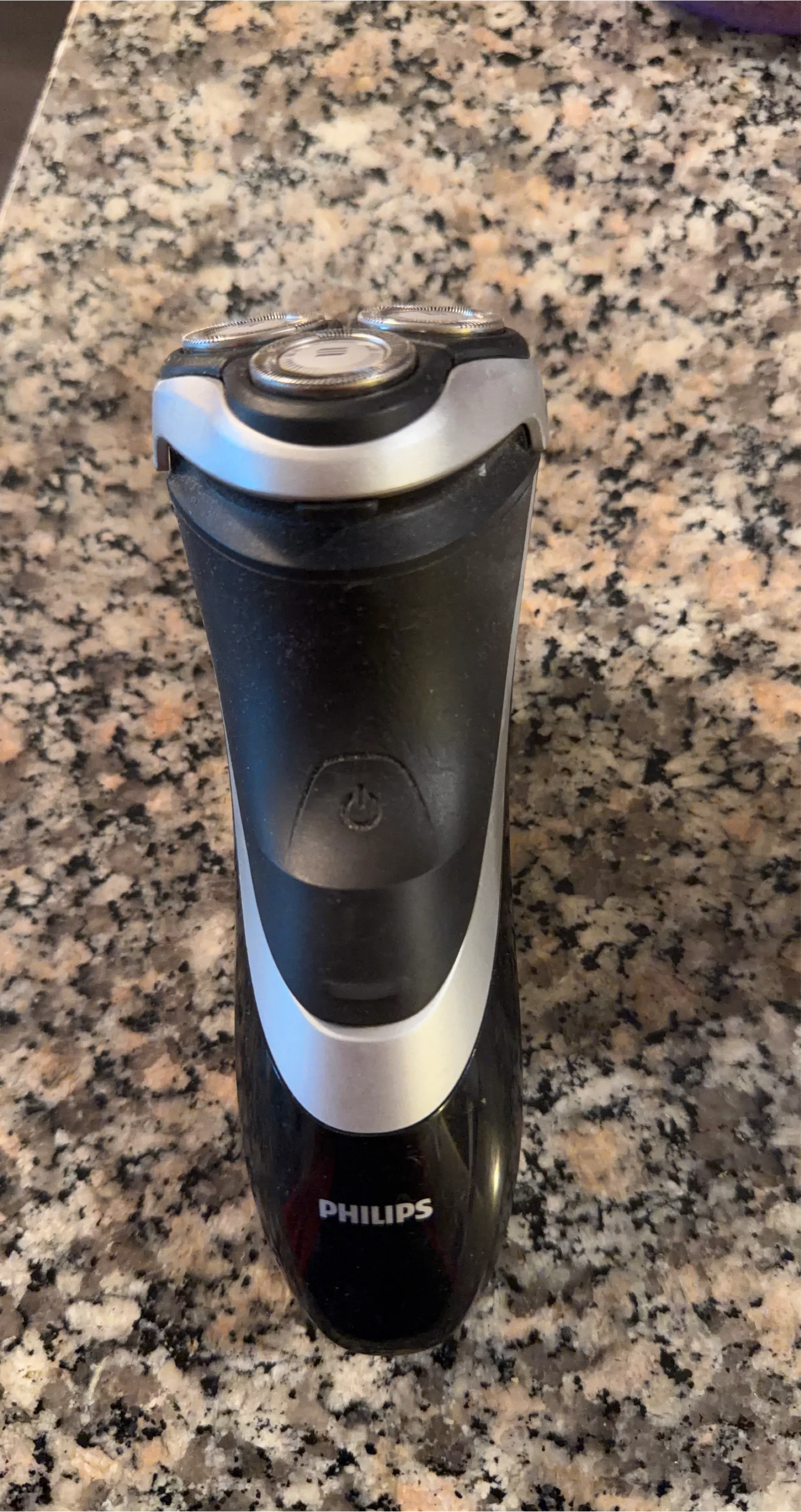 This is a Philips rotary shaver. It has a black and silver design with three spinning heads. It's powered on with a button on the front.