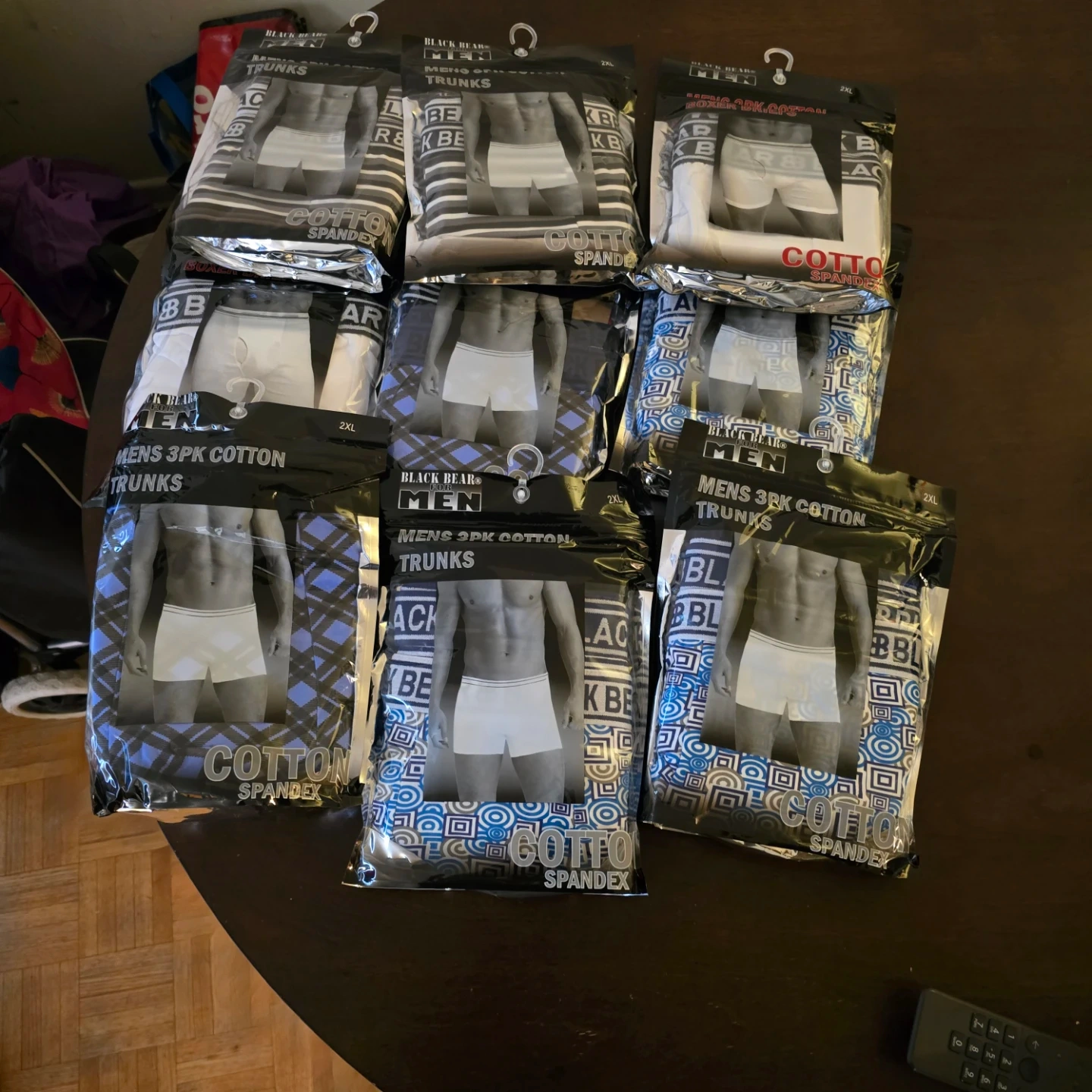 Nine brand new packages of Black Bear Men's 3pk cotton spandex trunks. Each package contains three pairs of trunks. They're size 2XL. Available in various colours with elastic waistbands. These are made with a cotton and spandex blend for comfort and stretch. Selling 15.00 per pack.