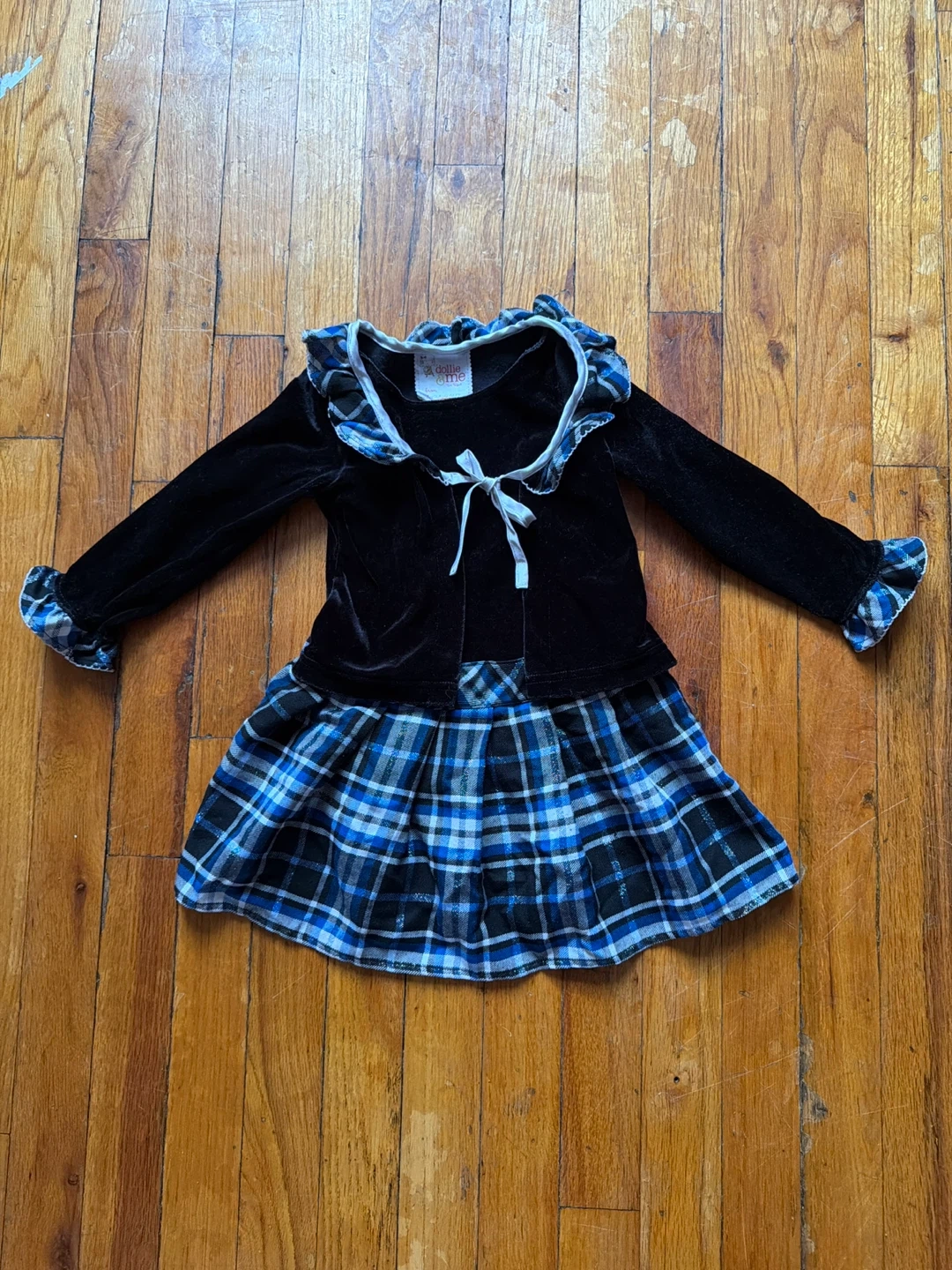 This Dollie & Me outfit features a black velvet bodice with a white ribbon tie and a blue plaid skirt. The matching cardigan has ruffled cuffs and collar. It's a cute set for your little one!