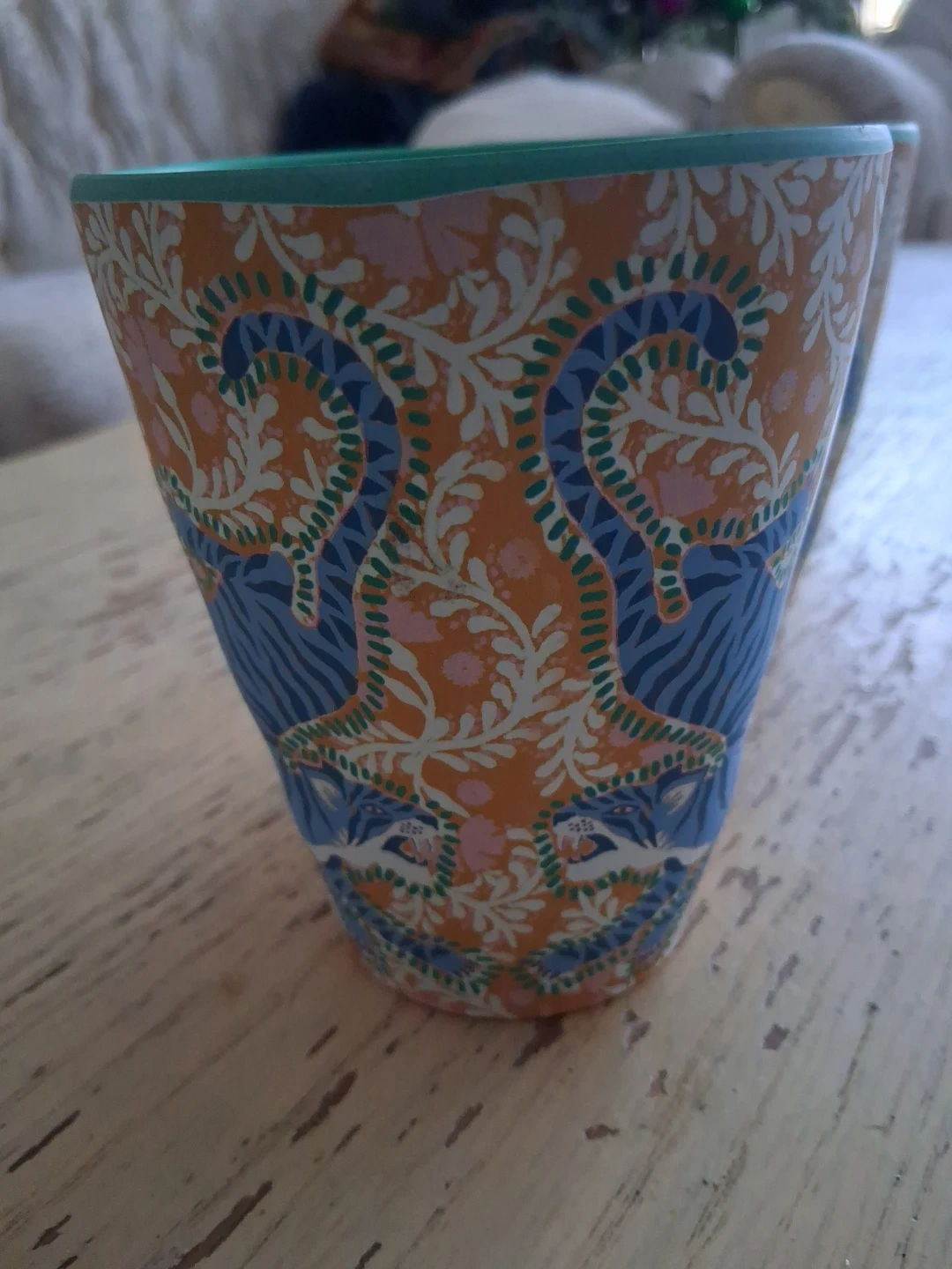 Set of two decorative tumblers featuring a vibrant orange, blue, and pink floral and animal print. Made exclusively for Anthropologie by Ellen Merchant. Perfect for a Housewarming gift or just for you! ❤️