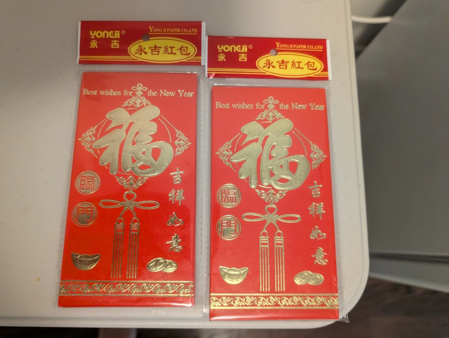 Two red envelopes from Yong Ji Paper Co., Ltd. decorated with gold Chinese characters and designs. They say 'Best wishes for the New Year'. These are perfect for Lunar New Year celebrations!