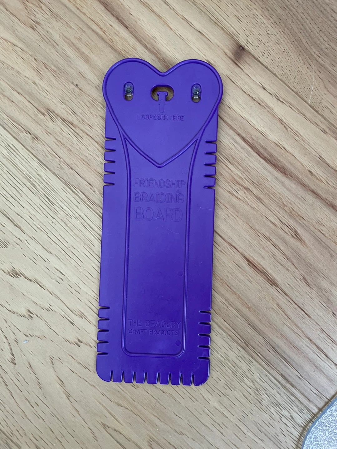 This is a purple friendship braiding board made by The Beadery Craft Products. It's designed for looping cord to create braids. Craft board for making friendship bracelets.
