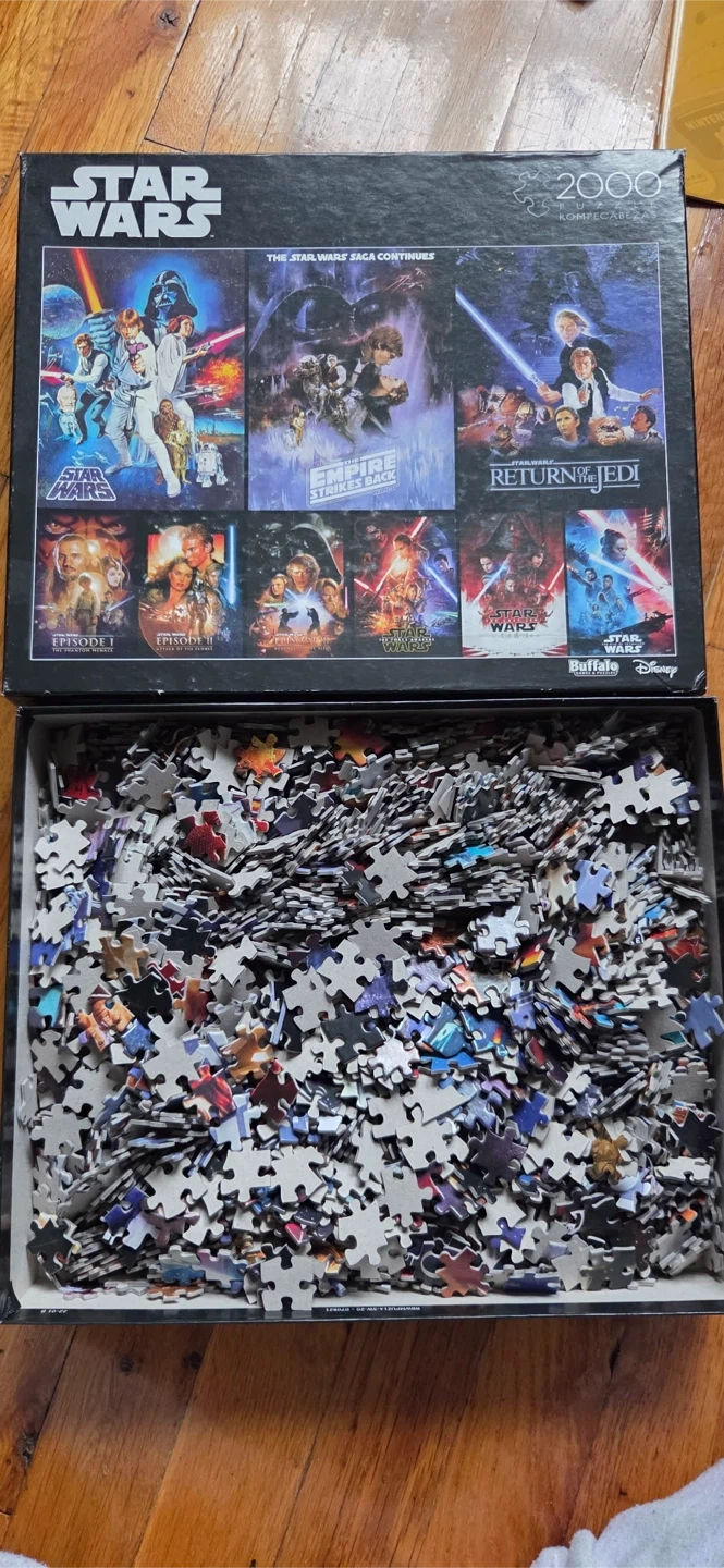 Selling a Star Wars The Saga Continues 2000 piece puzzle. This puzzle features iconic scenes from the Star Wars movies. It's ready for a new owner to assemble and enjoy!