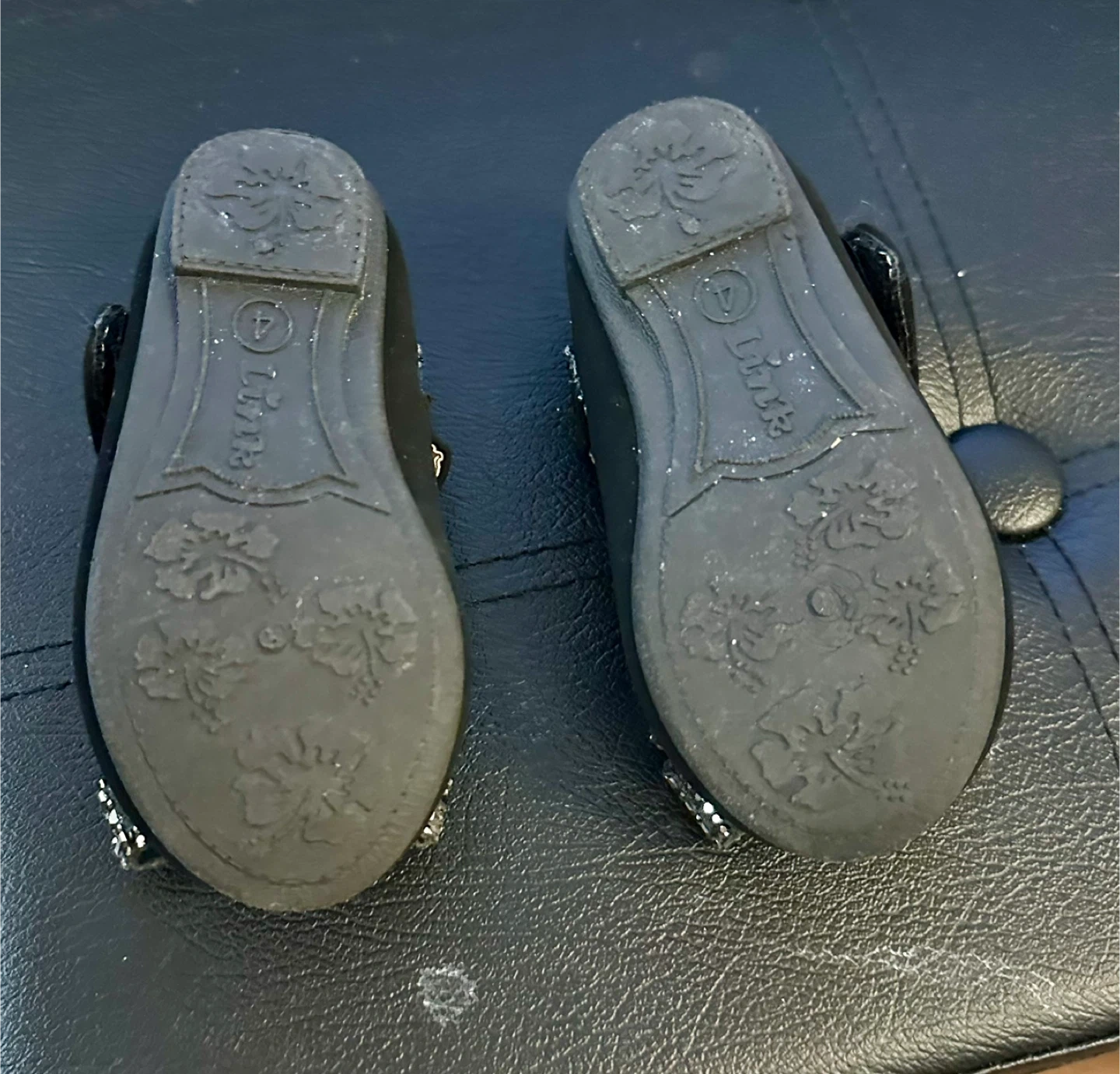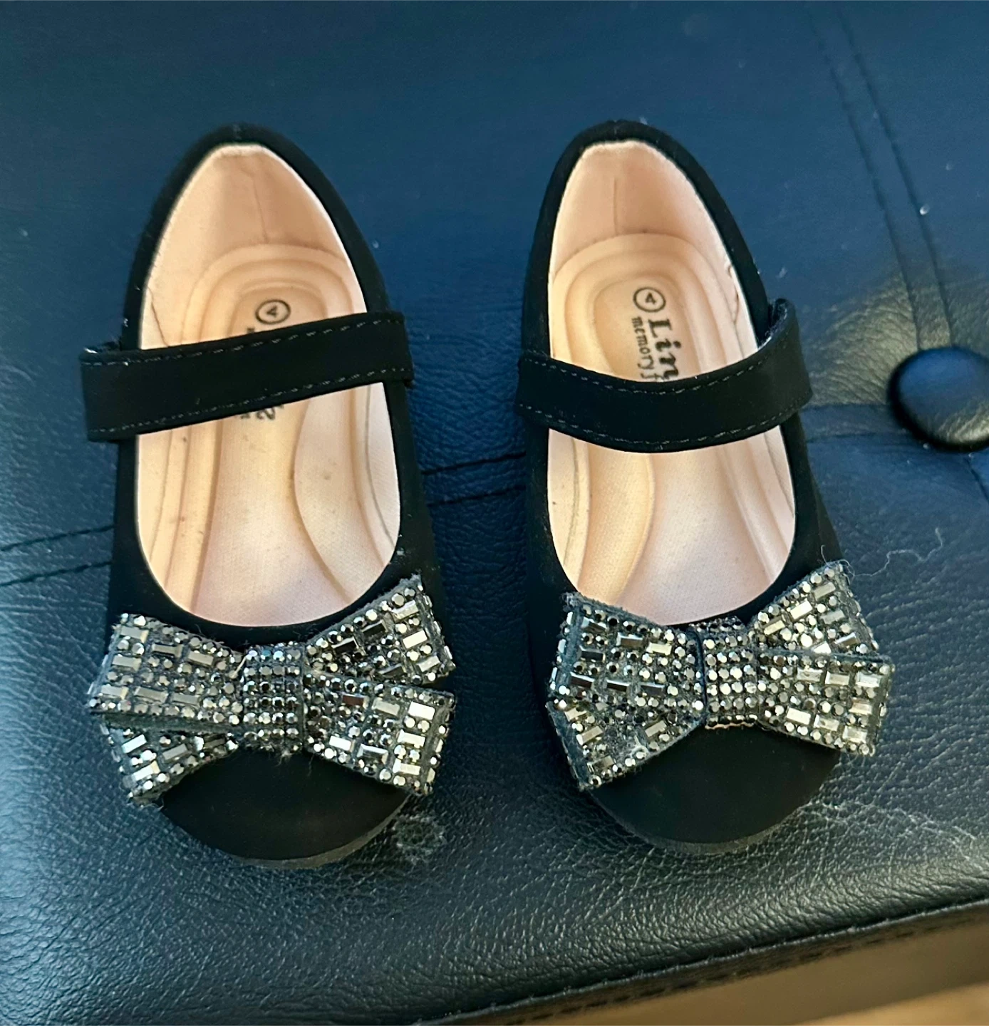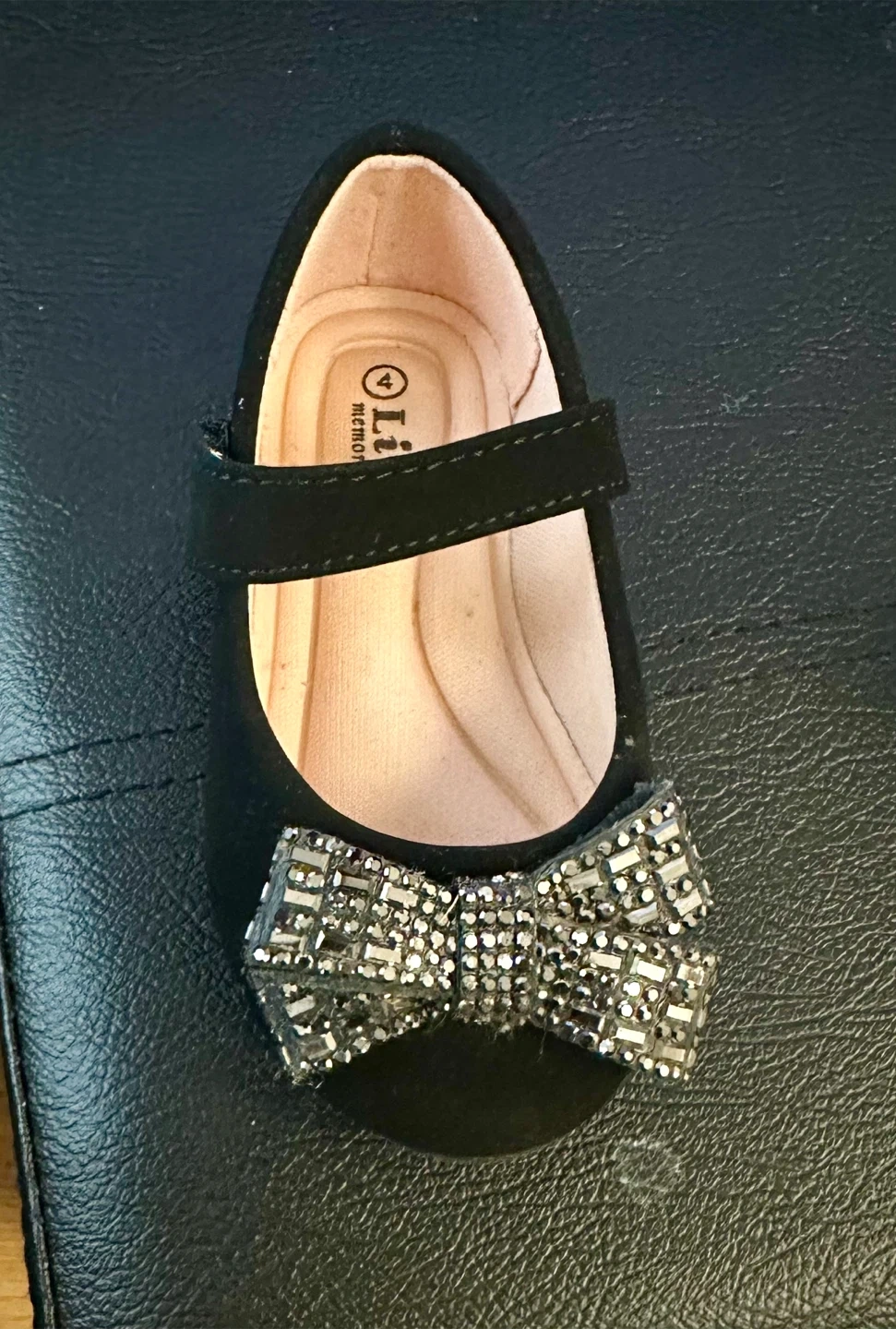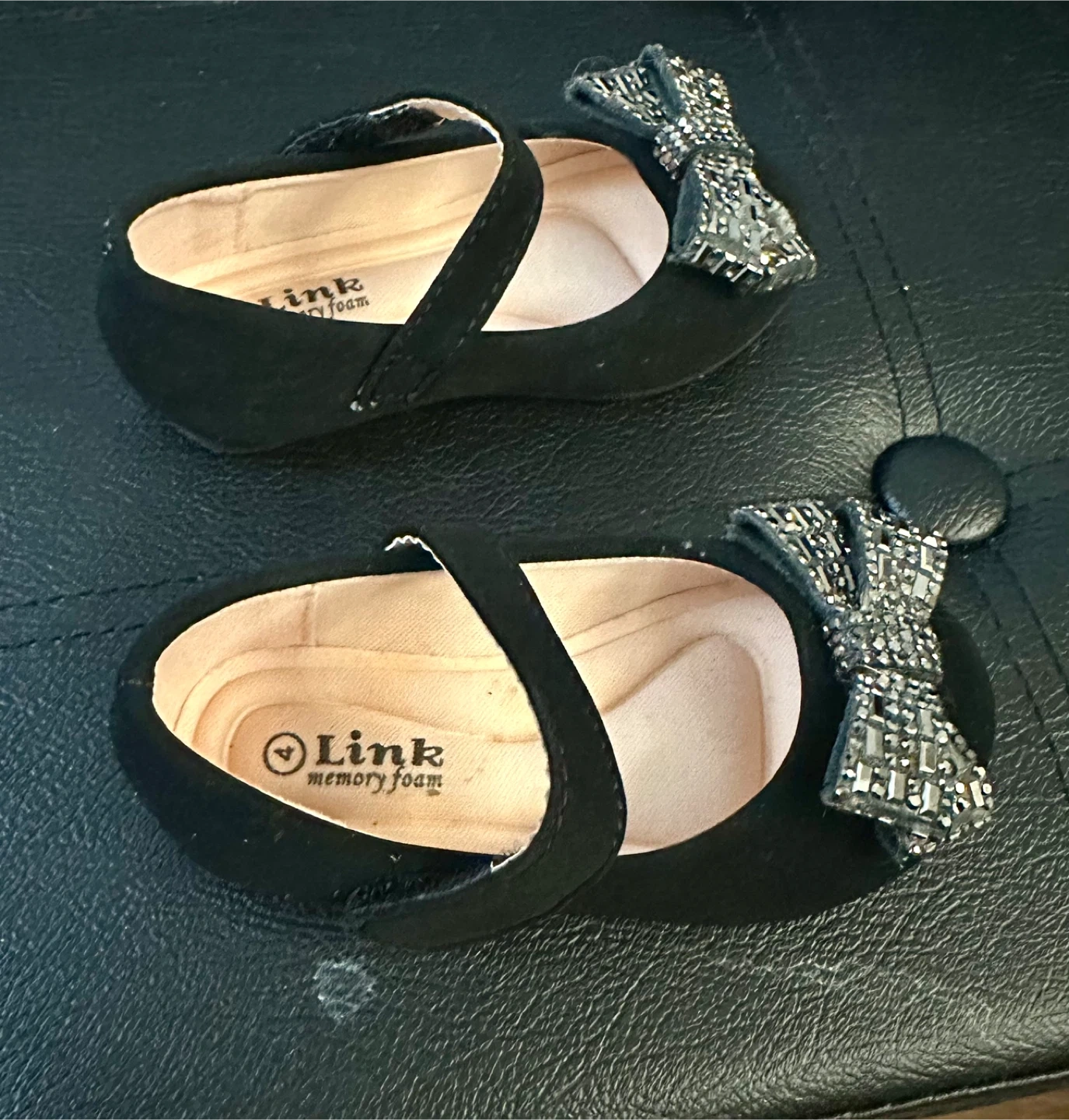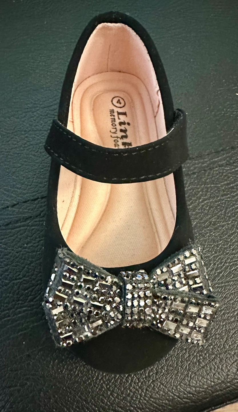 These adorable black dress shoes from Link are in great condition and ready for your little one! They feature a cute bow detail with sparkly accents and a convenient velcro strap. Size 4. Pickup or extra for delivery.