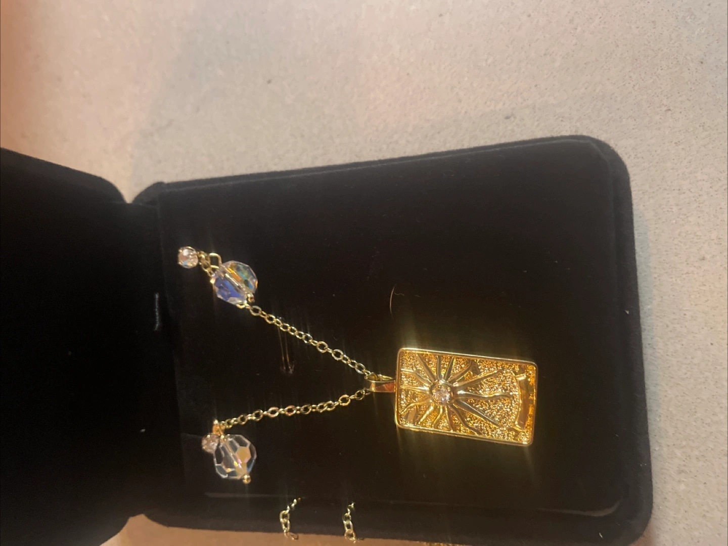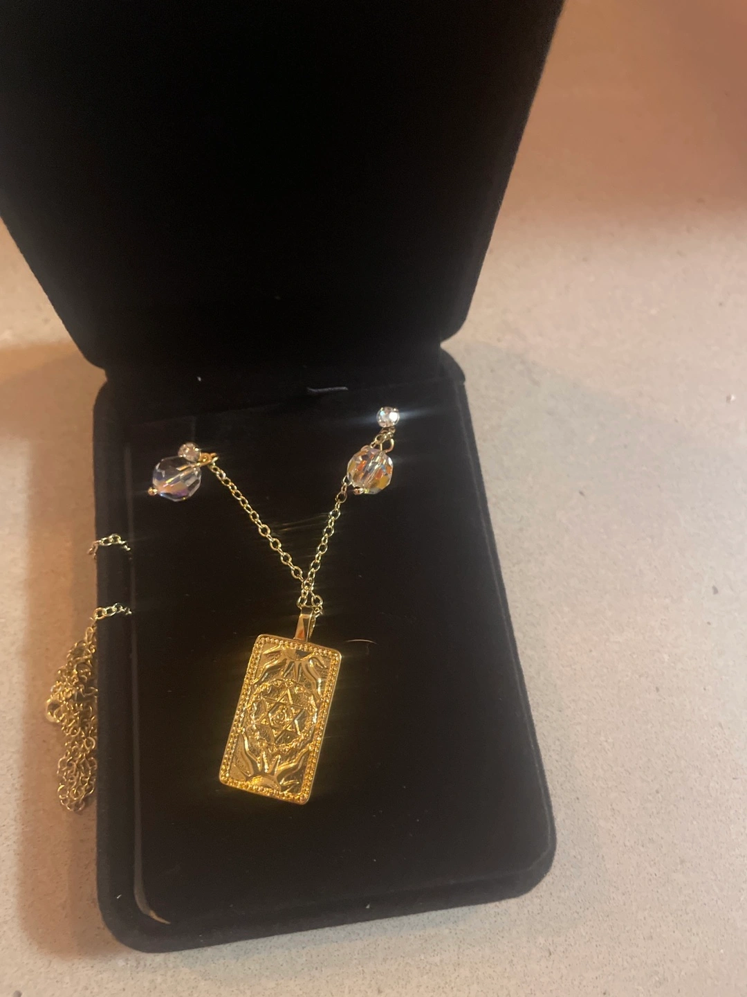 Selling a beautiful gol tarot card necklace! It comes in a black box, perfect for gifting or keeping it safe. The necklace features a detailed tarot card pendant and delicate crystal bead accents on the chain. It's in great condition and ready to add a touch of mystique to your style
