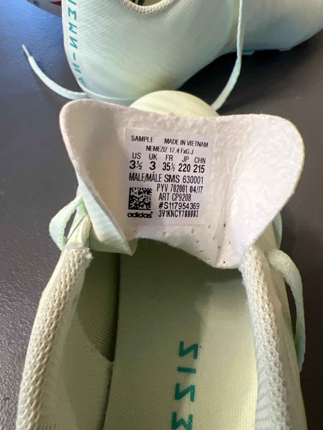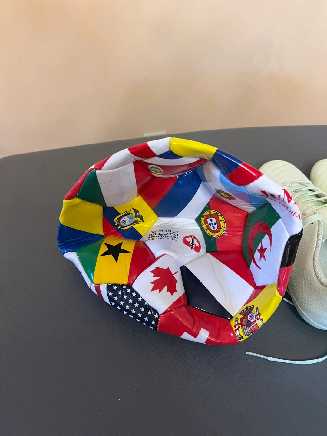 Light green Adidas soccer cleats, size 17.4. Size 3 1/2 she was about 9 1/2 inches in length Includes a soccer ball featuring international flags. Ball size is 5. Item comes from a pet and smoke free home. Porch union/401/Pickering for pick up. The price is for both items together.
