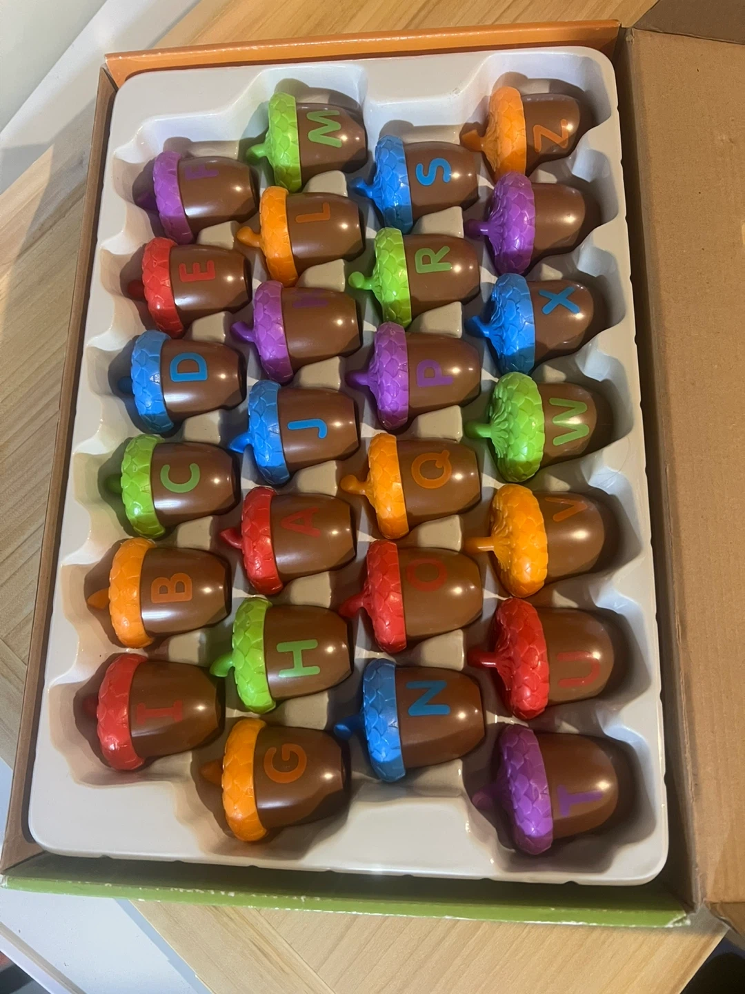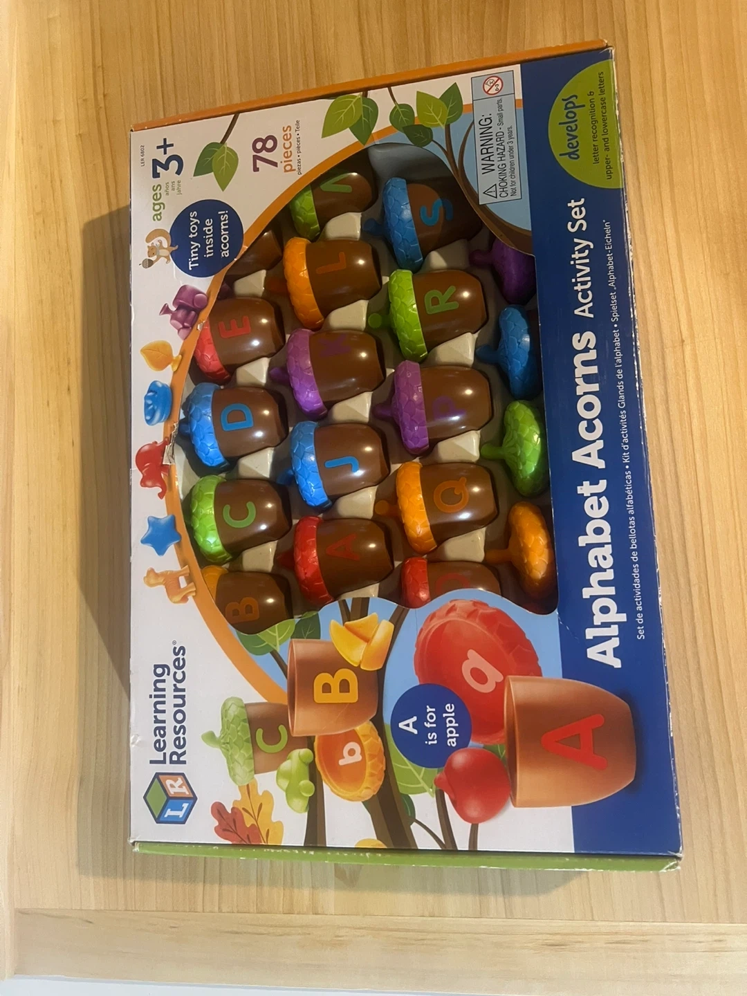 This set includes 78 pieces of Learning Resources Alphabet Acorns. Each acorn has a letter on it. Suitable for ages 3 and up. Develops letter recognition and upper and lowercase letters.