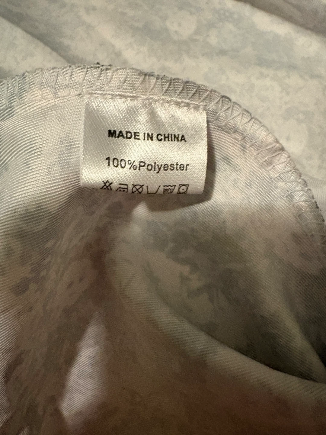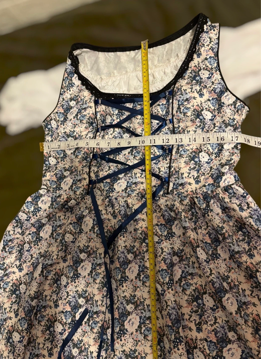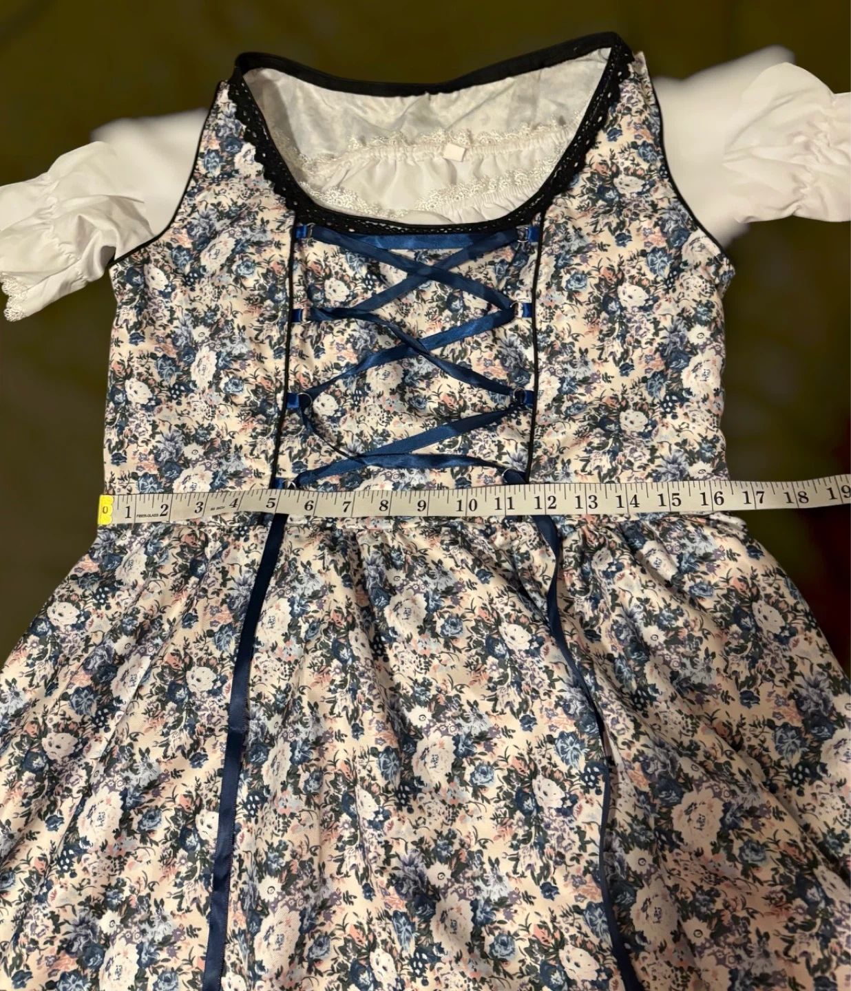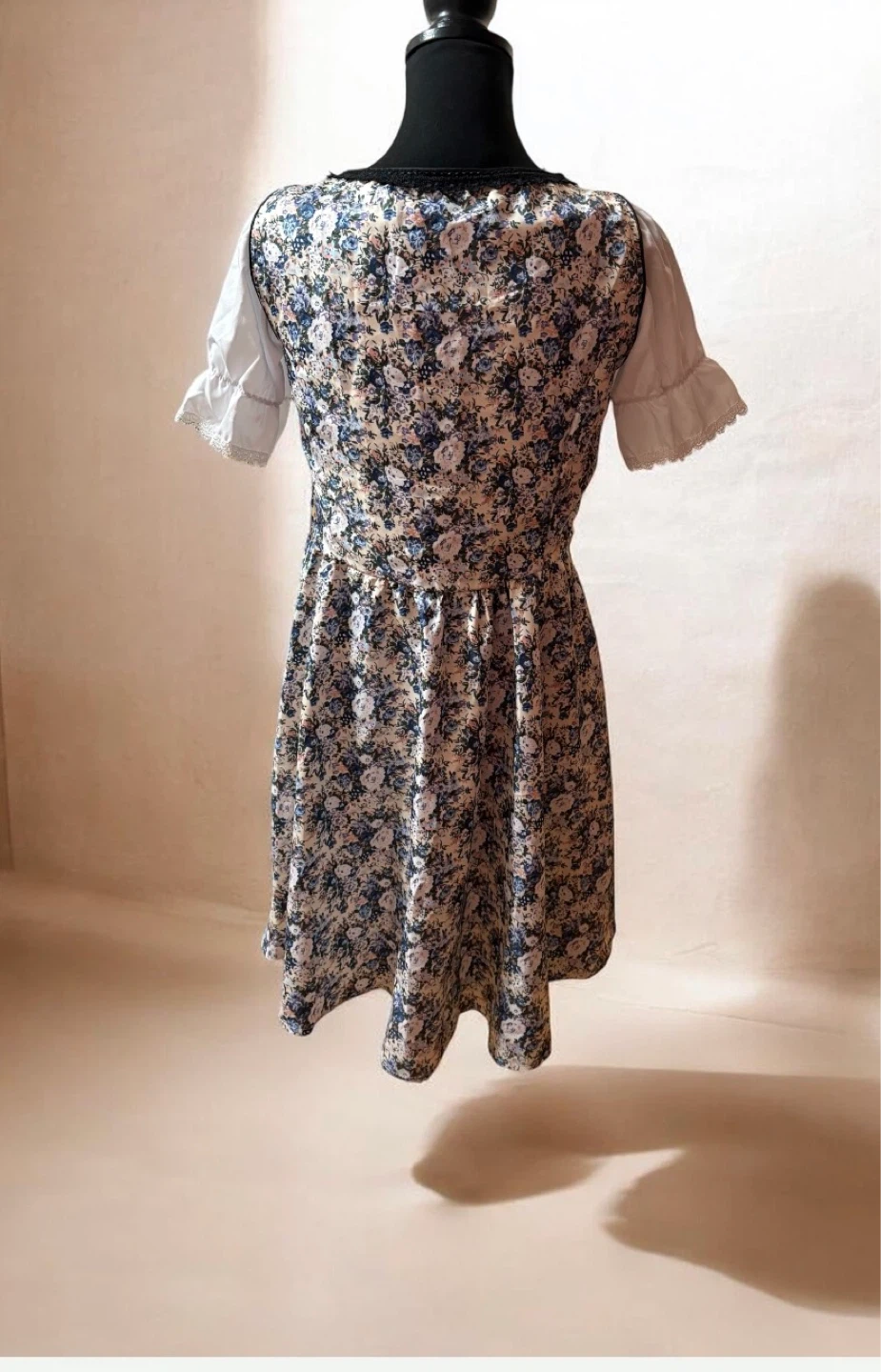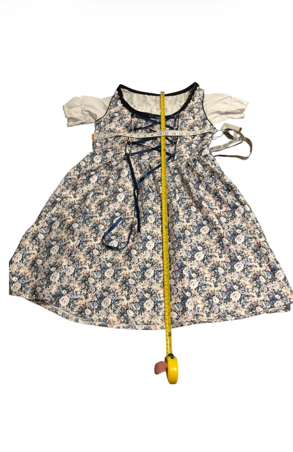 This is a floral dirndl dress with an attached white blouse. It features a lace-up front and blue ribbon accents. Waist measures 17 inches across. Length is 31 inches from shoulder.