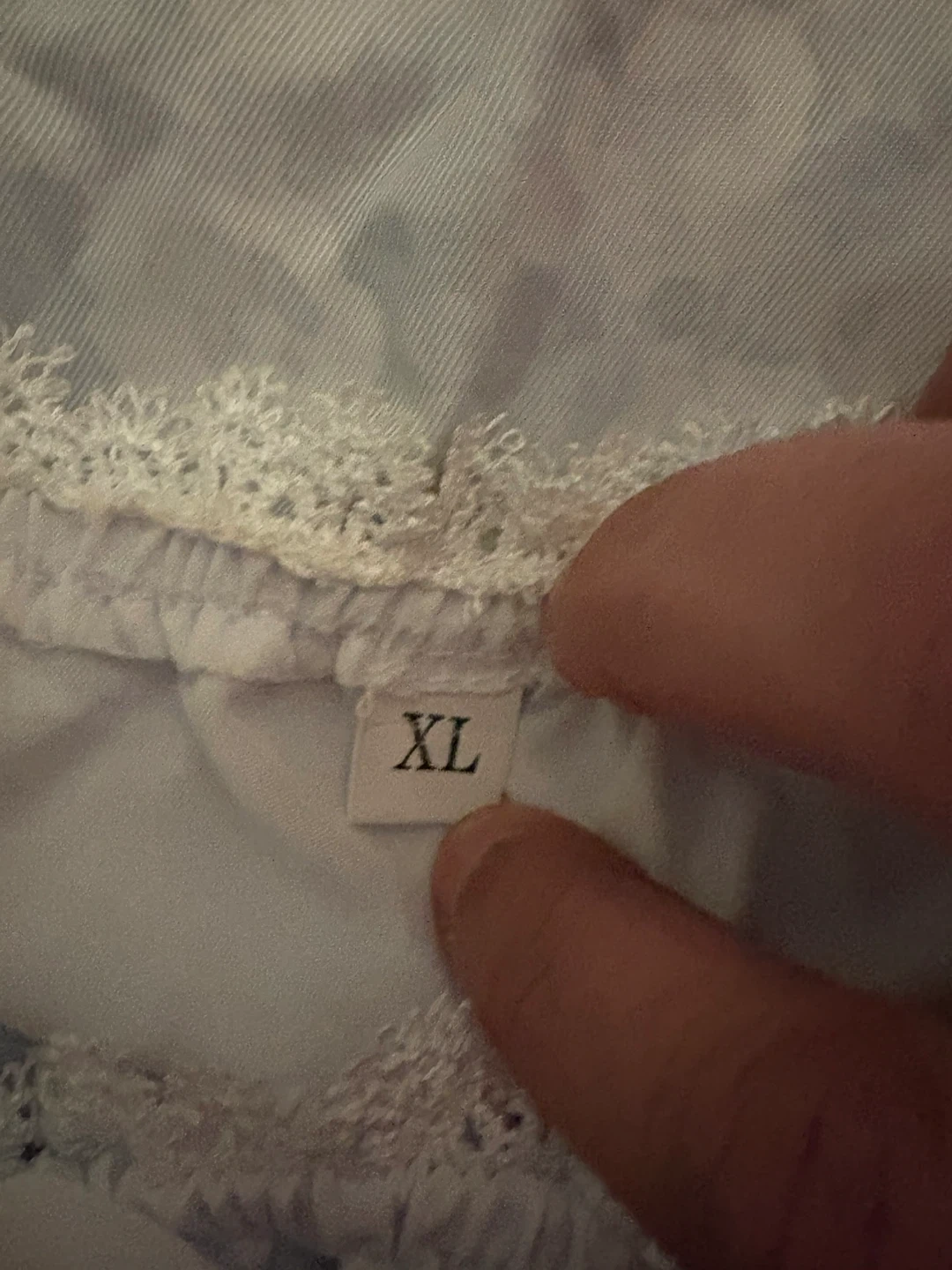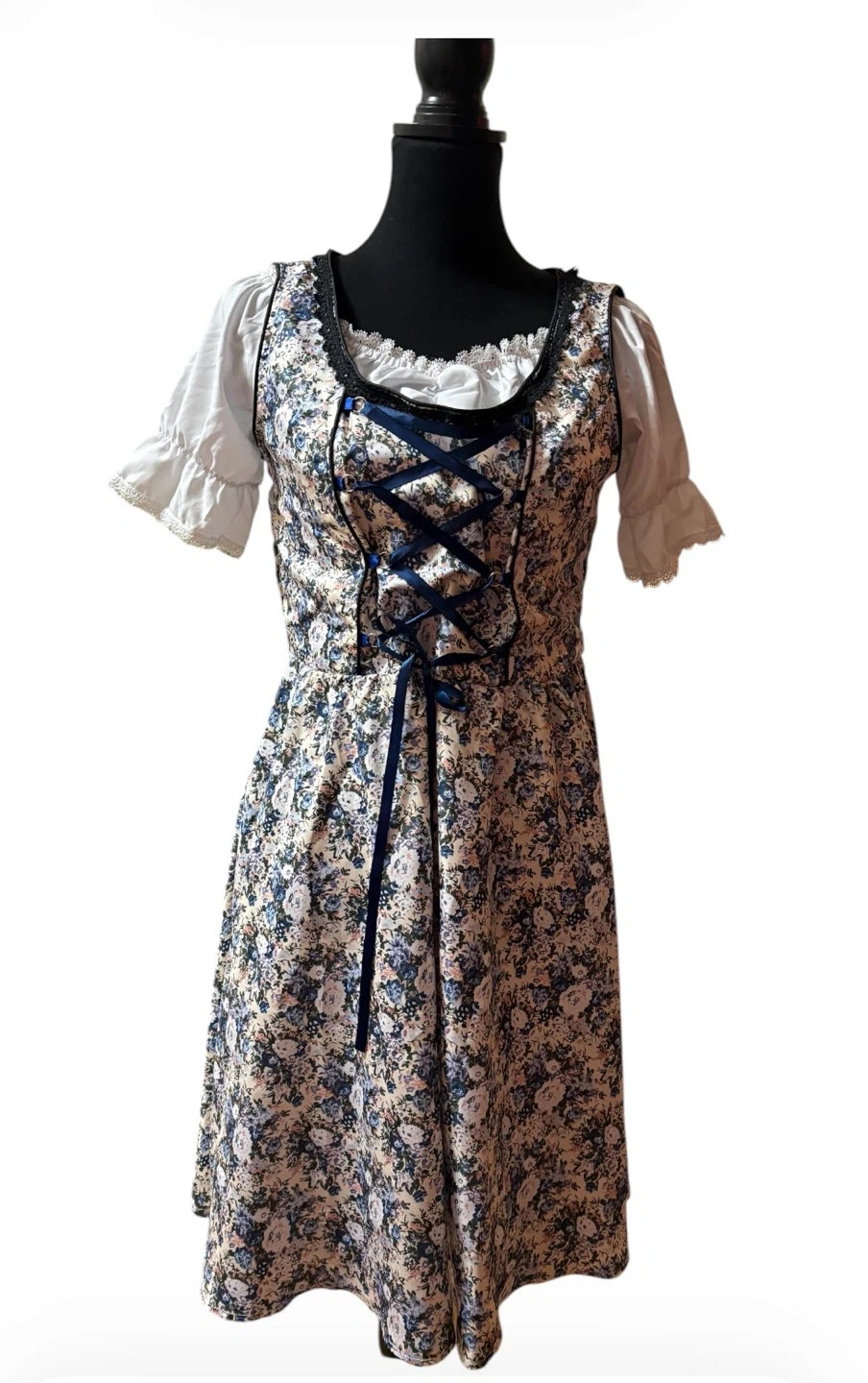 This is a floral dirndl dress with an attached white blouse. It features a lace-up front and blue ribbon accents. Waist measures 17 inches across. Length is 31 inches from shoulder.
