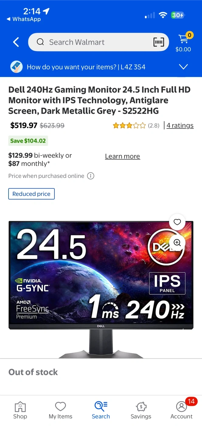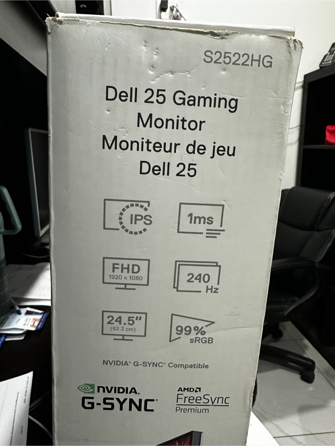 Dell 24.5 inch FHD gaming monitor with 240Hz refresh rate and 1ms response time. Features IPS panel with NVIDIA G-SYNC compatibility and AMD FreeSync Premium support. Includes original box.