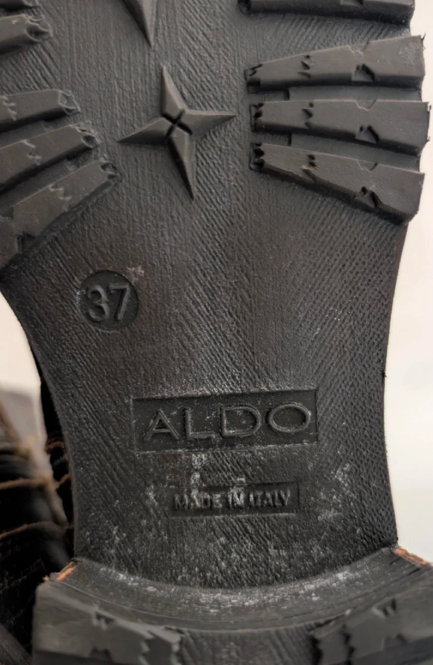 These ALDO boots are made from dark brown leather and feature decorative silver studs. They have a shaft height of approximately 14 inches and a buckle strap detail around the ankle. The sole is black rubber with a lug pattern. Made in Italy.