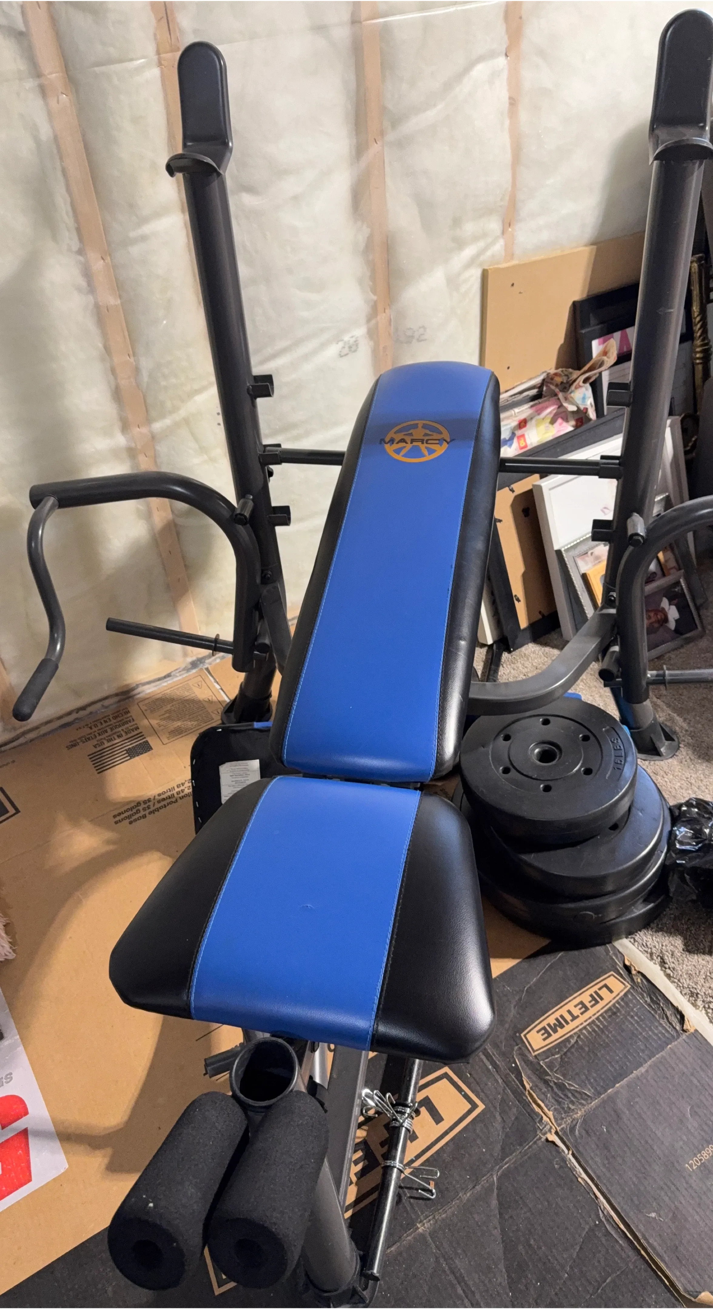This Marcy workout bench is designed for a variety of strength training exercises. It features a padded seat and backrest in blue and black. Some weight plates are included.