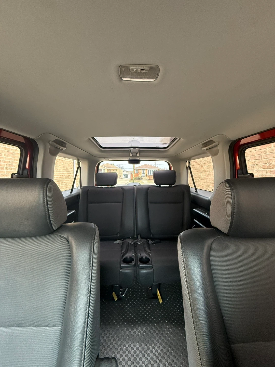 Honda Element SUV in orange. This vehicle has a spacious interior with black seats and a sunroof. It's a practical choice for everyday use!